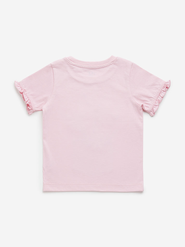 Crafted from a cotton-rich material. this pink t-shirt by HOP kids flaunts floral embroidery paired with text designs. It comes finished with a crew neck and short sleeves featuring ruffle detailing.