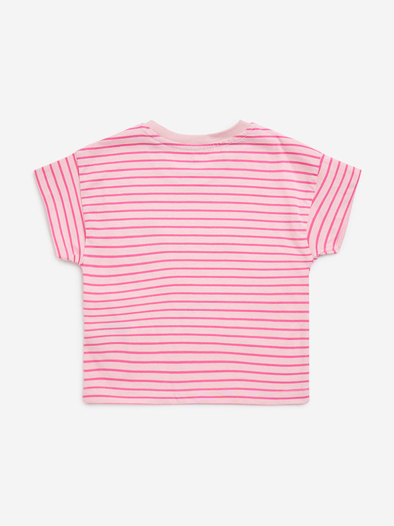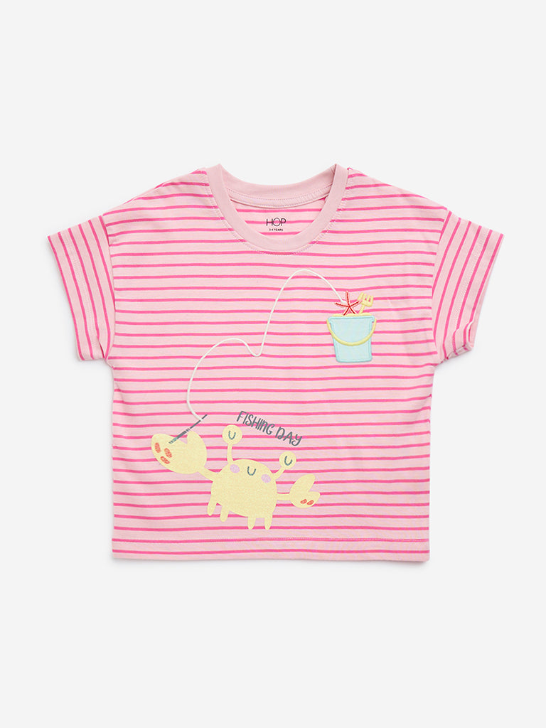HOP Kids presents this pink t-shirt showcasing playful beach-inspired motifs atop a striped base. Milled from pure-cotton. it includes a round neck and short sleeves.