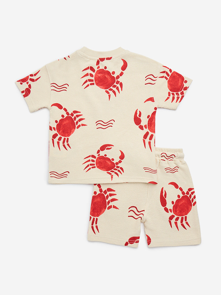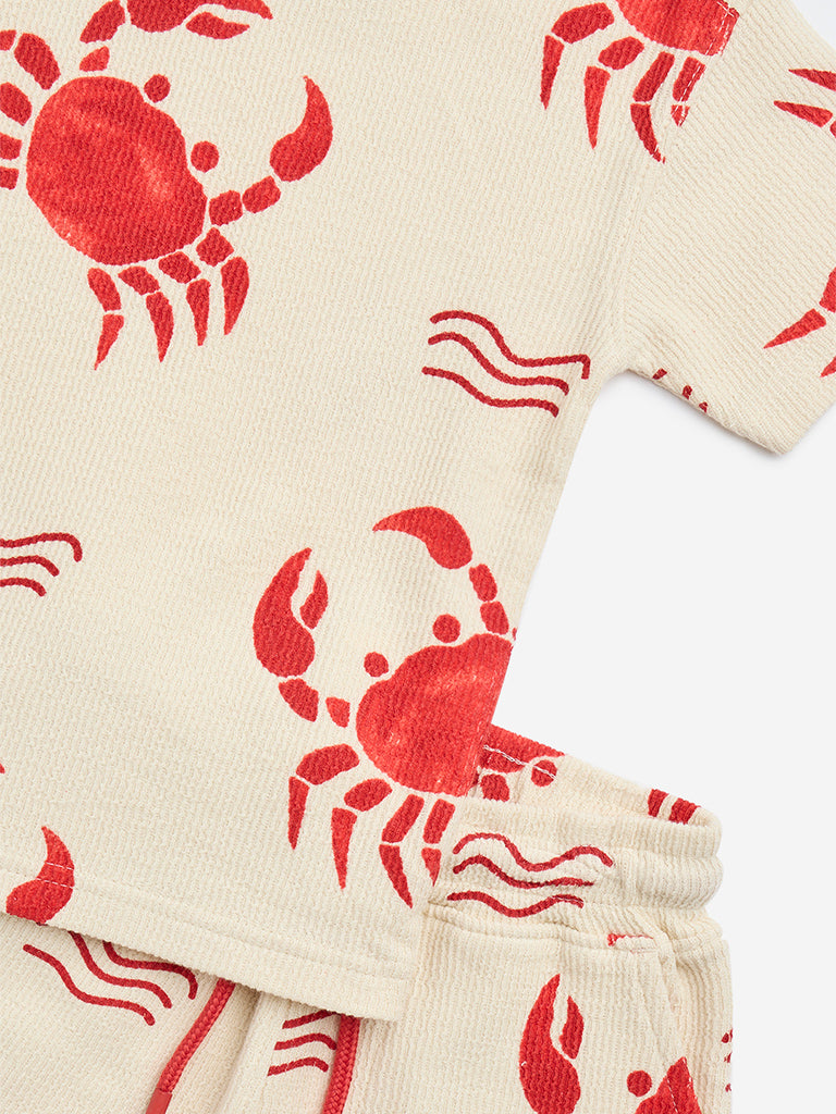 HOP Kids presents this vibrant red set. featuring a t-shirt and shorts set. both adorned with cheerful crab prints. Crafted from pure cotton for ultimate comfort. the t-shirt includes a classic crew neck and short sleeves. The coordinating shorts are designed with an elasticated waistband and convenient side pockets. combining style with practicality for everyday wear.