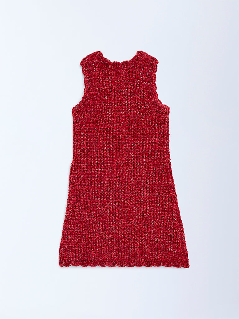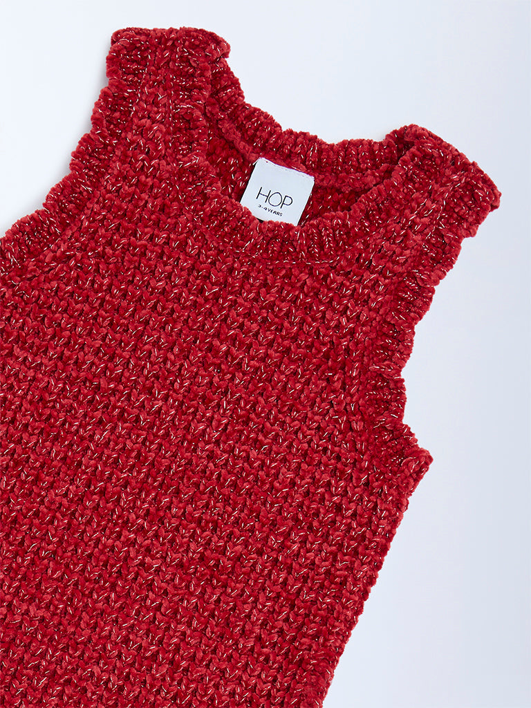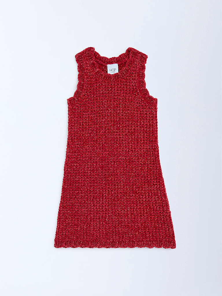 HOP Kids presents this red dress. crafted in a soft knit texture with a subtle metallic sheen. Finished with a scalloped crew neck and sleeveless cut. this vibrant red dress is perfect for party moments as it is comfortable. stylish and playful all at the same time.