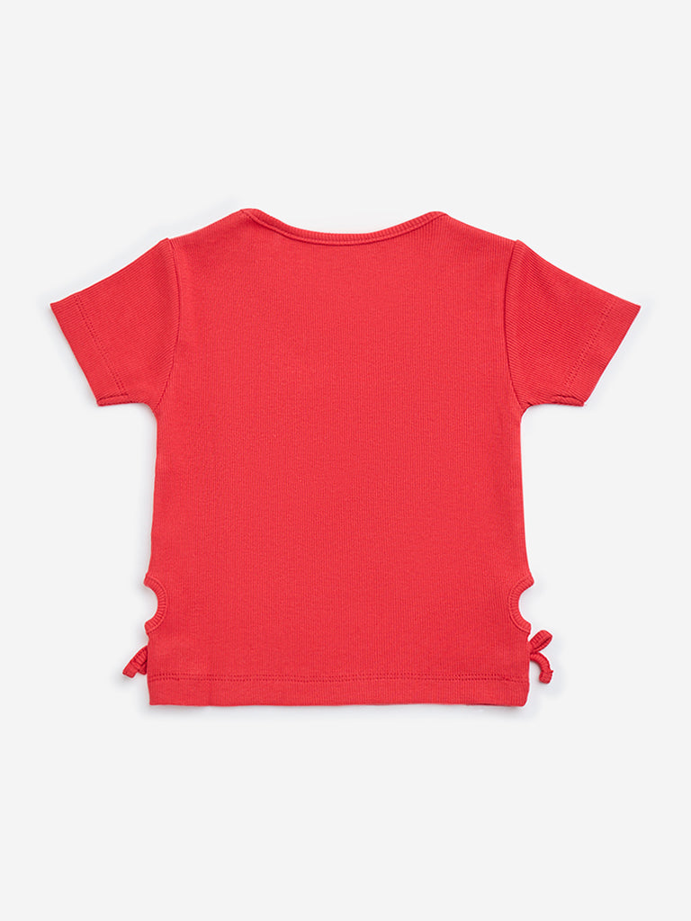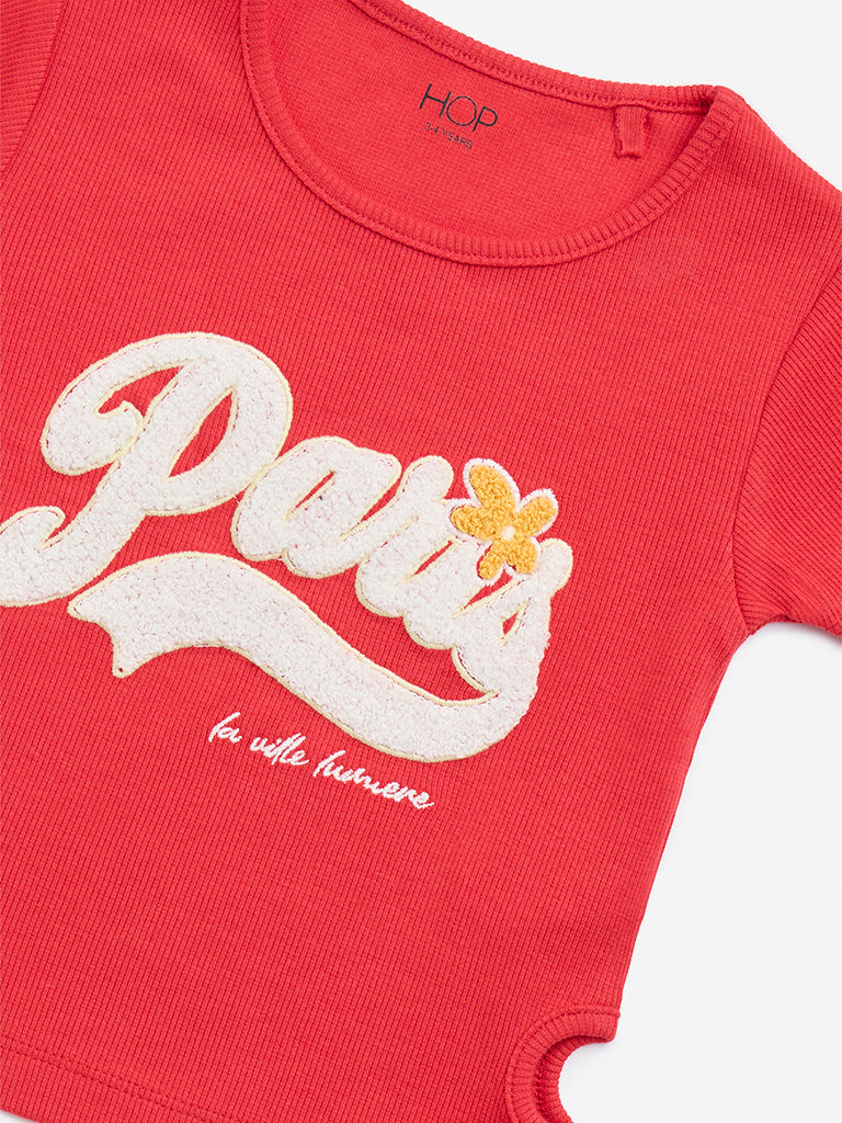 This red t-shirt from HOP Kids features a trendy text design with a cute floral accent for added charm. Made from soft. breathable fabric. it includes adjustable side ties and offers a regular fit for all-day comfort.