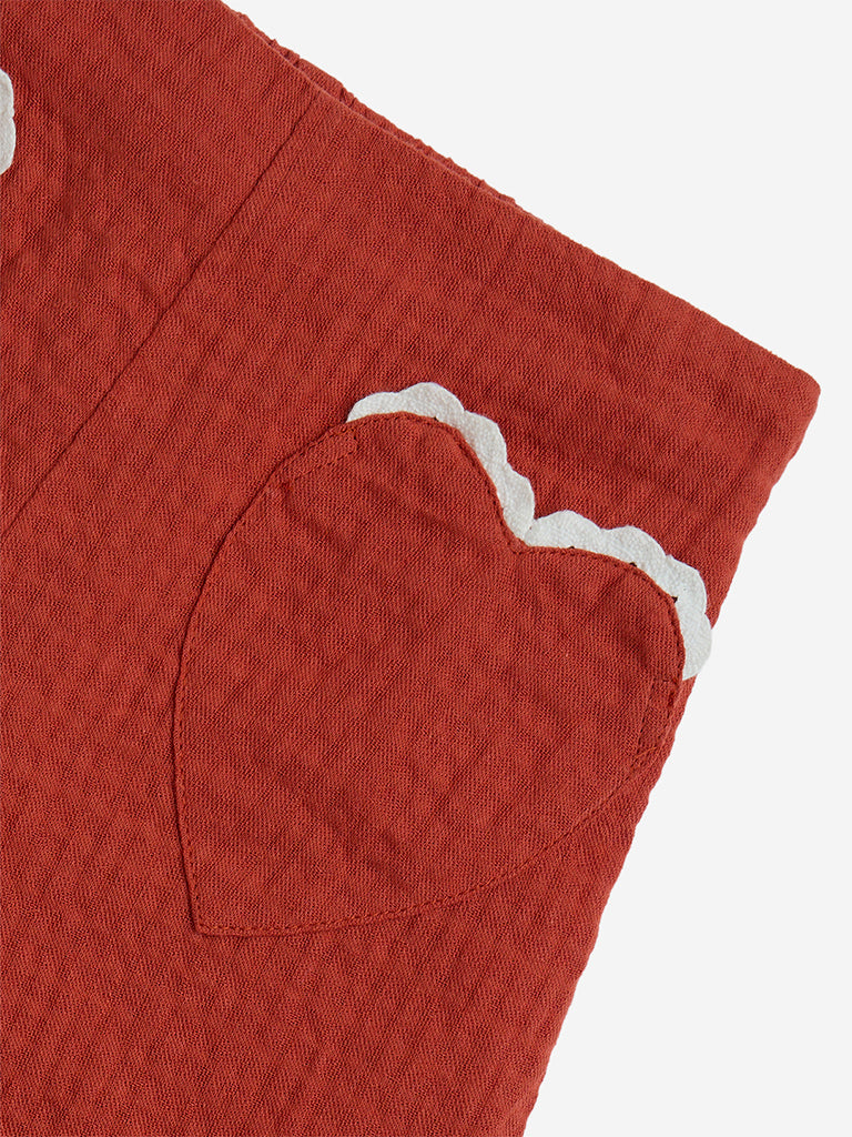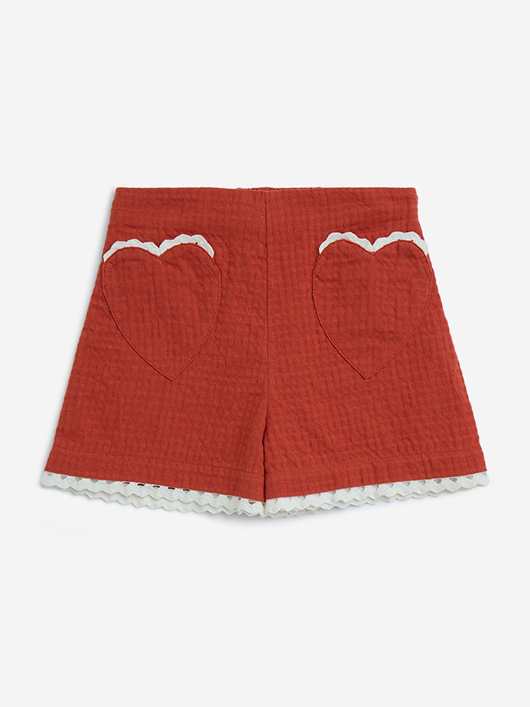 These rust shorts from HOP Kids are milled from a crinkle-textured fabric that ensures all-day comfort with a playful twist. Designed with charming heart-shaped front pockets. they add a dash of fun to everyday dressing. The elasticated waistband offers a snug fit. while the scalloped hems give the silhouette a flattering finish.