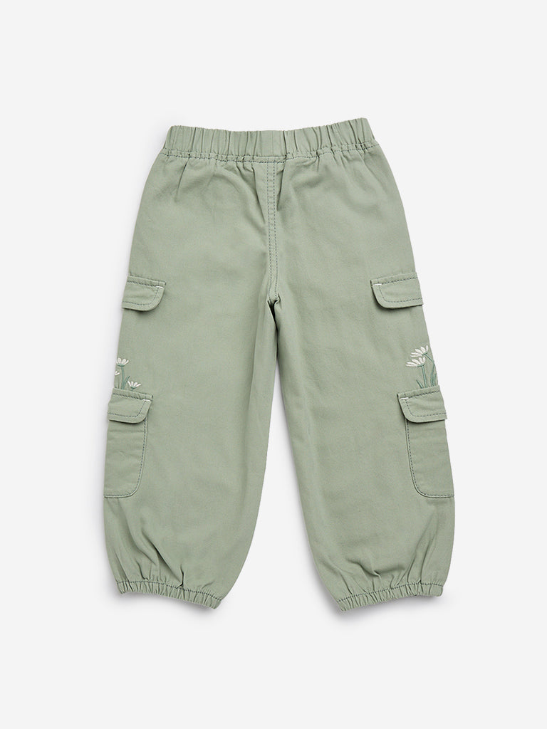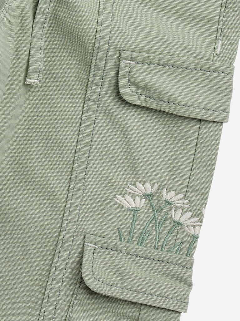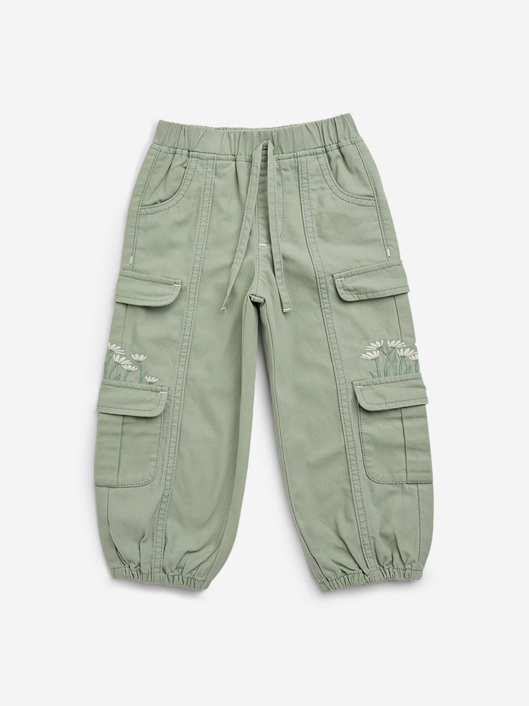 These sage joggers from HOP Kids feature delicate floral embroidery for a charming touch. Designed in a cargo style. they come with multiple pockets. an elasticated waistband with drawstrings. and cuffed hems for a relaxed and comfortable fit.