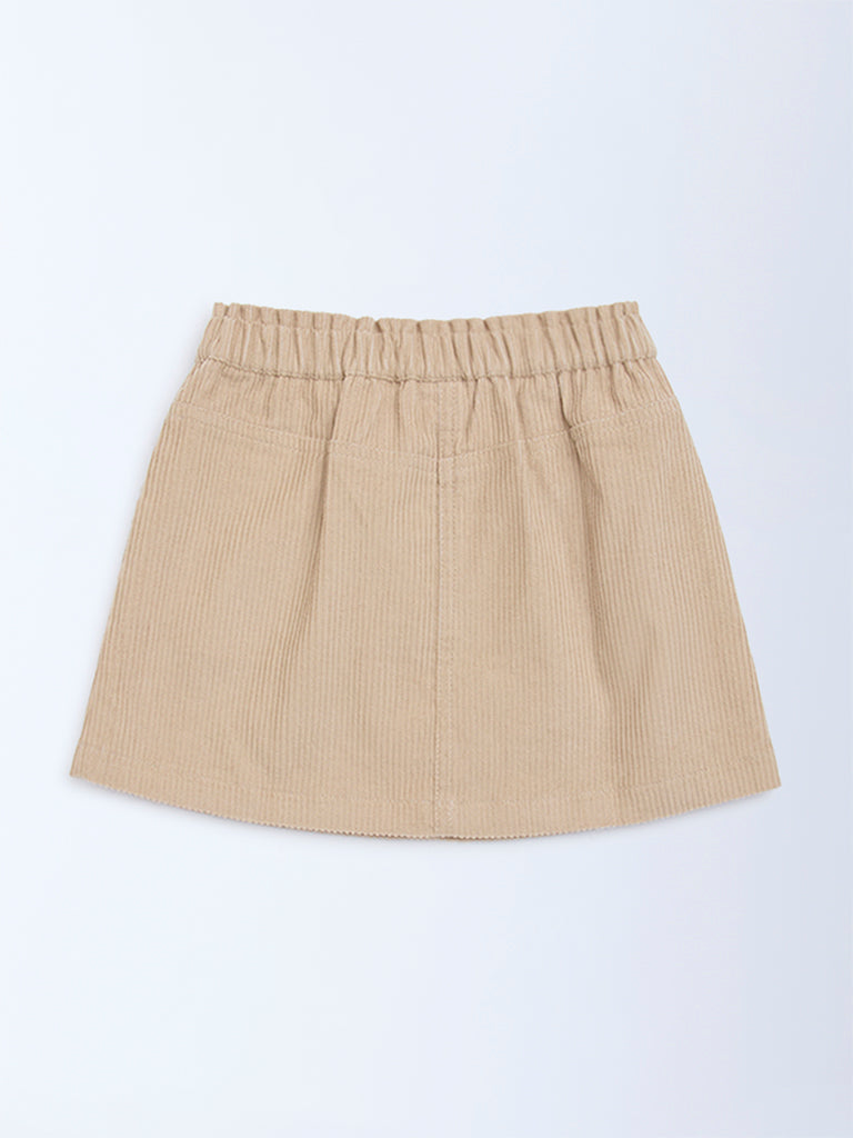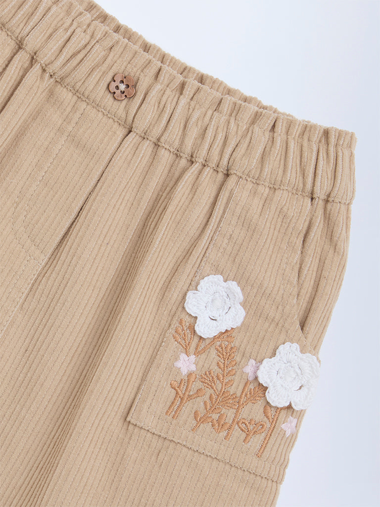 This taupe high-rise cotton skirt from HOP Kids combines comfort with playful detail. Crafted with a corduroy texture for a soft finish. it features a smooth elastic waistband and side pockets adorned with floral embroidery. making it both stylish and practical for everyday wear.
