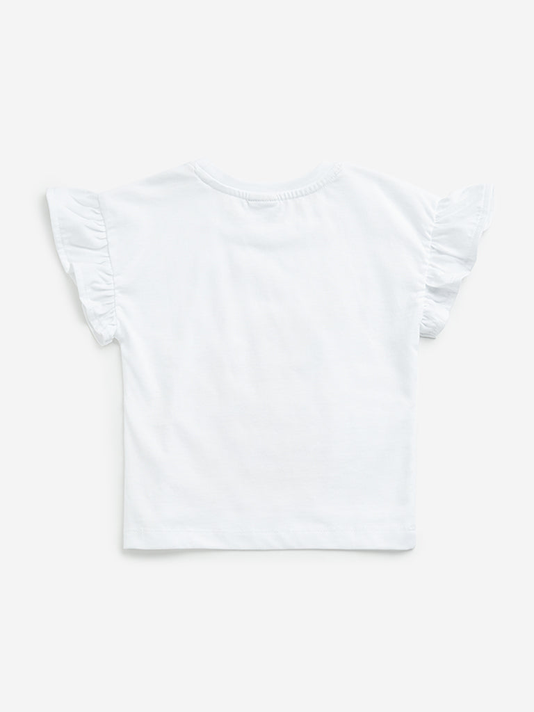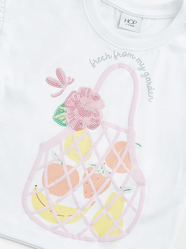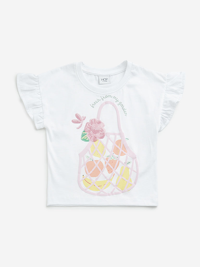 This adorable white top by HOP kids features charming and colourful embellishes for a touch of sweetness. It has short. ruffled sleeves and the comfy fit keeps your little one cozy. perfect for playtime or cuddles.