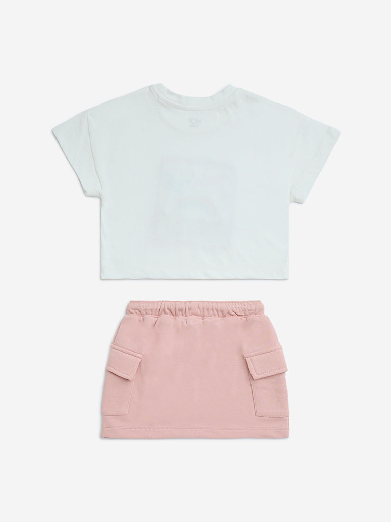 HOP Kids White Printed Cotton T-Shirt and Skirt Set