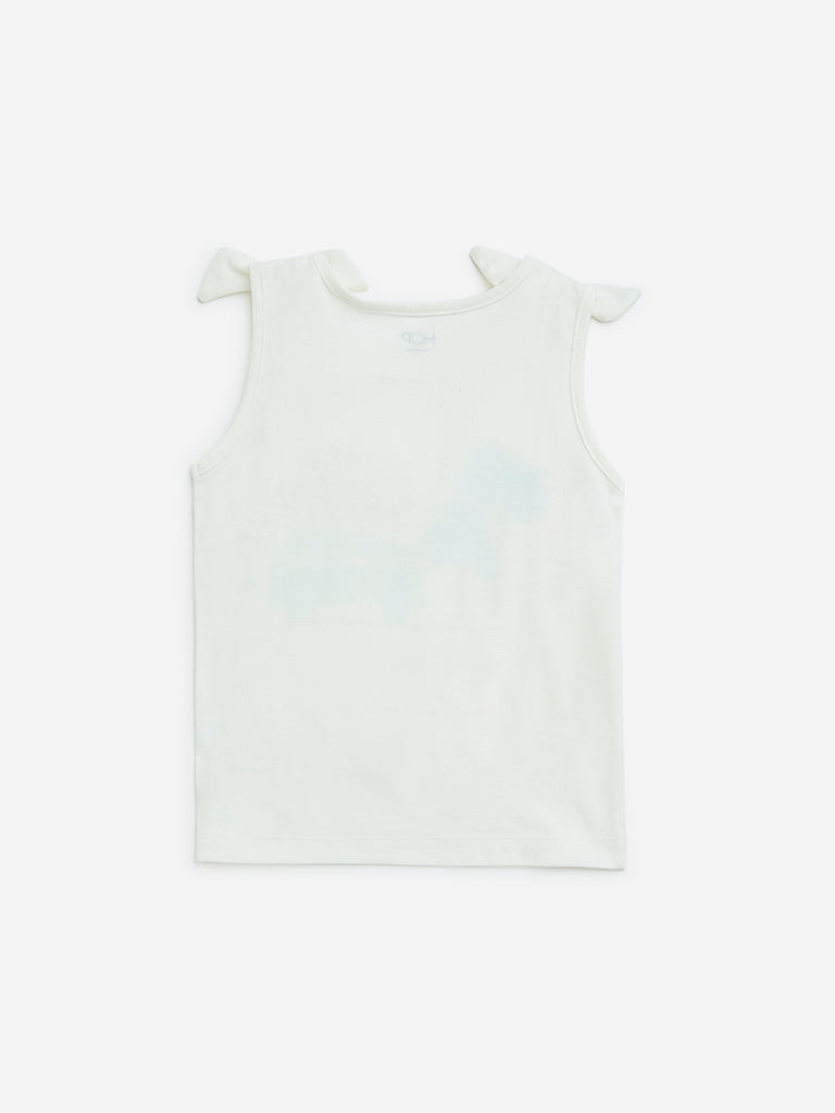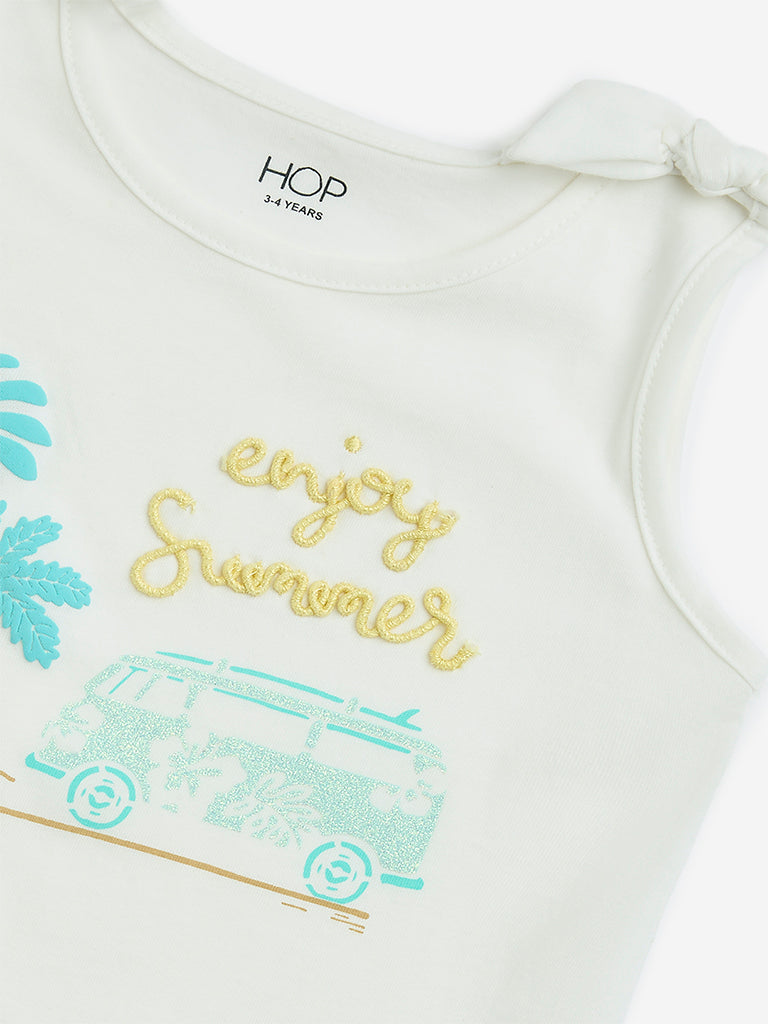 This white top by HOP Kids features tropical inspired designs. highlighting text prints and embellished motif. Woven from a cotton-rich fabric. it is finished with a round neck and tie-up detailed shoulder straps.
