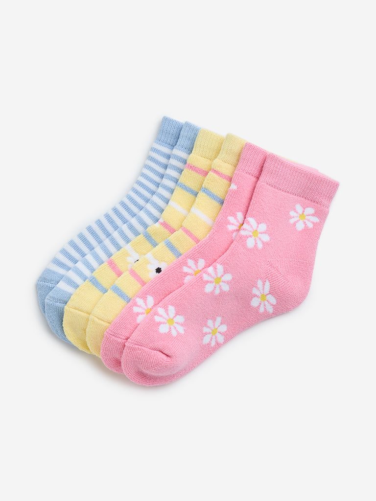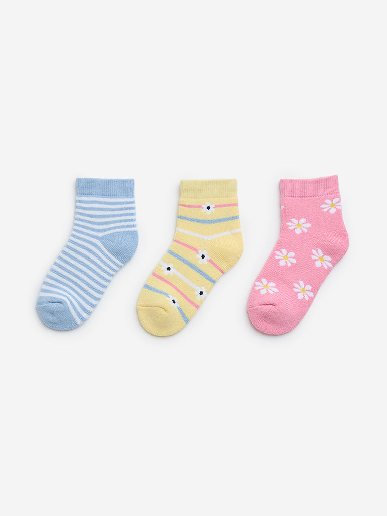 HOP Kids presents this pack of three ankle-length socks in pink. blue. and yellow. each adorned with playful stripes and floral prints. Crafted from soft and stretchable fabric. these socks offer a comfortable fit. while the cushioned toe and heel provide extra support for all-day wear.