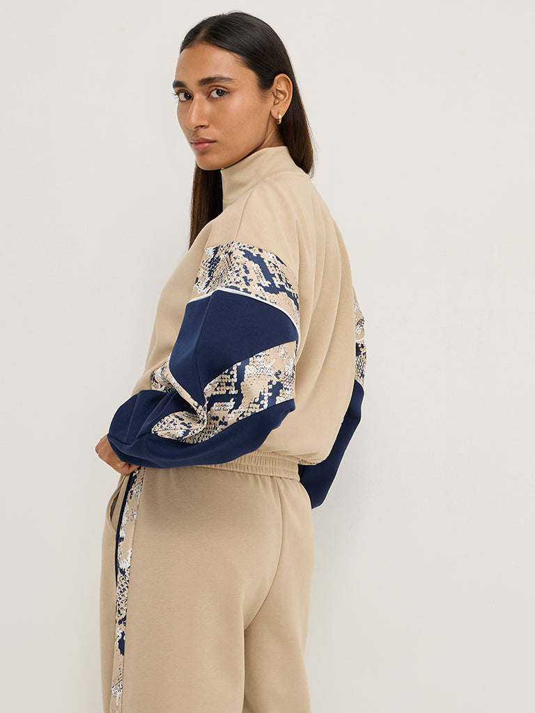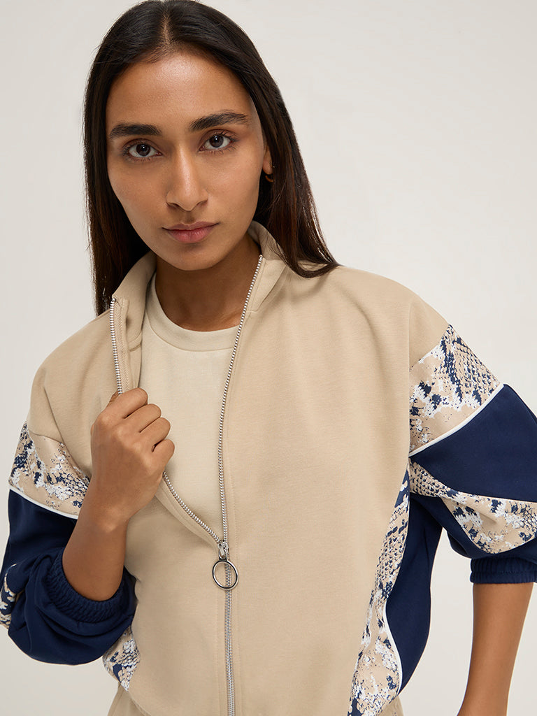 This beige jacket from LOV flaunts abstract prints. Spun from a breathable fabric. it includes a high-neck collar that extends to a zipper placket and full sleeves.