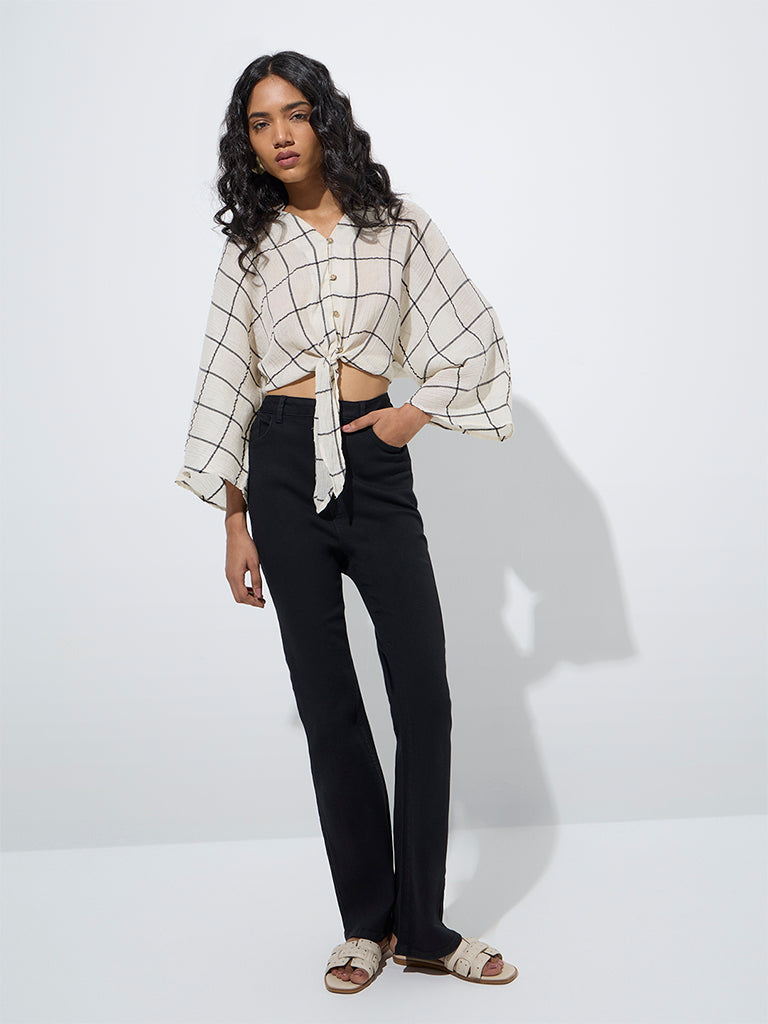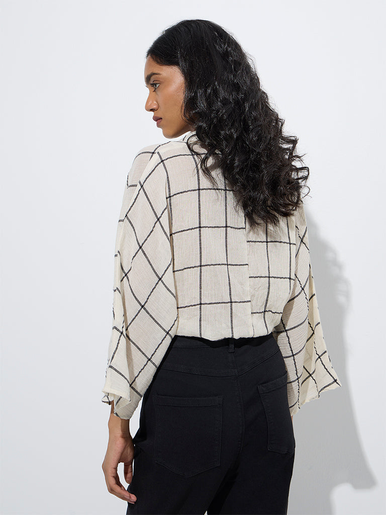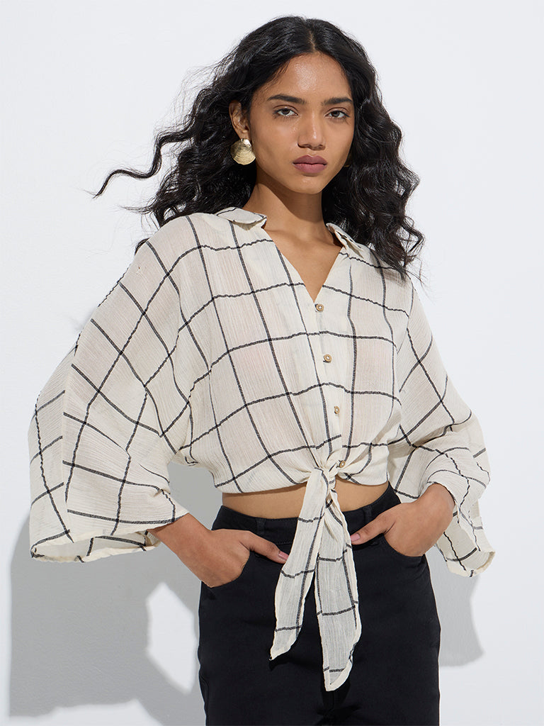 This beige blouse from LOV is defined with a bold checkered print for a modern twist. Made from pure cotton. it’s designed with a smart collar that extends into a button placket and is finished with bell sleeves. A tie-up detail at the front accentuates its appeal. adding a playful yet polished touch.