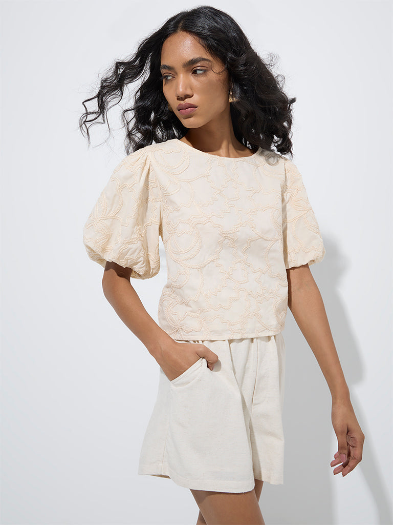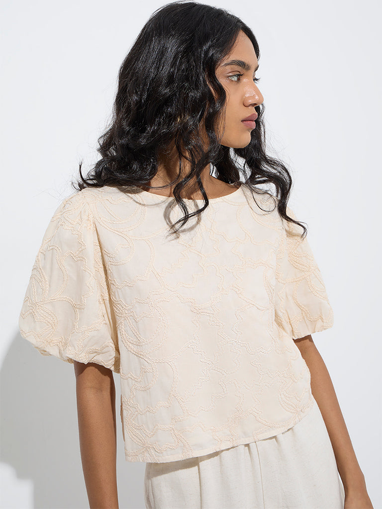 This beige top from LOV is crafted from pure cotton and elevated with intricate embroidery that adds quiet charm. Designed with a wide boat neck and airy blouson sleeves. it brings an effortlessly graceful touch to everyday dressing.