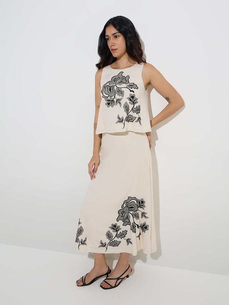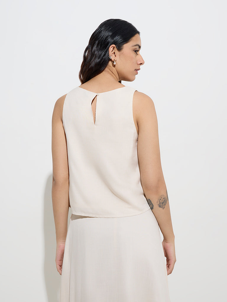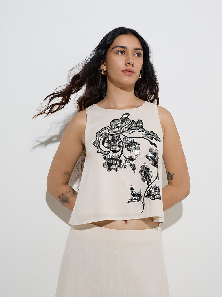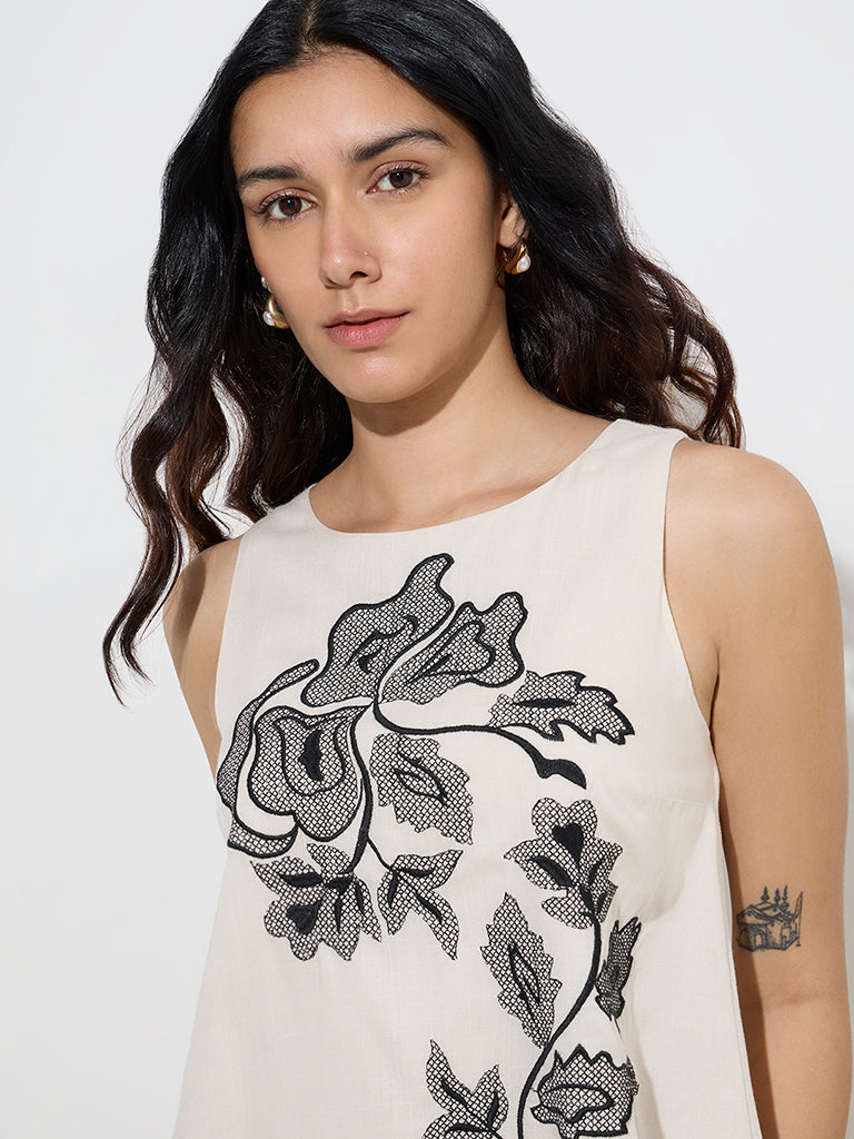 Adorned with foliage embroidery for a nature-inspired charm. this beige top from LOV is crafted from a breathable fabric. Designed with a classic round neckline and a sleeveless cut. it offers effortless elegance and all-day comfort.