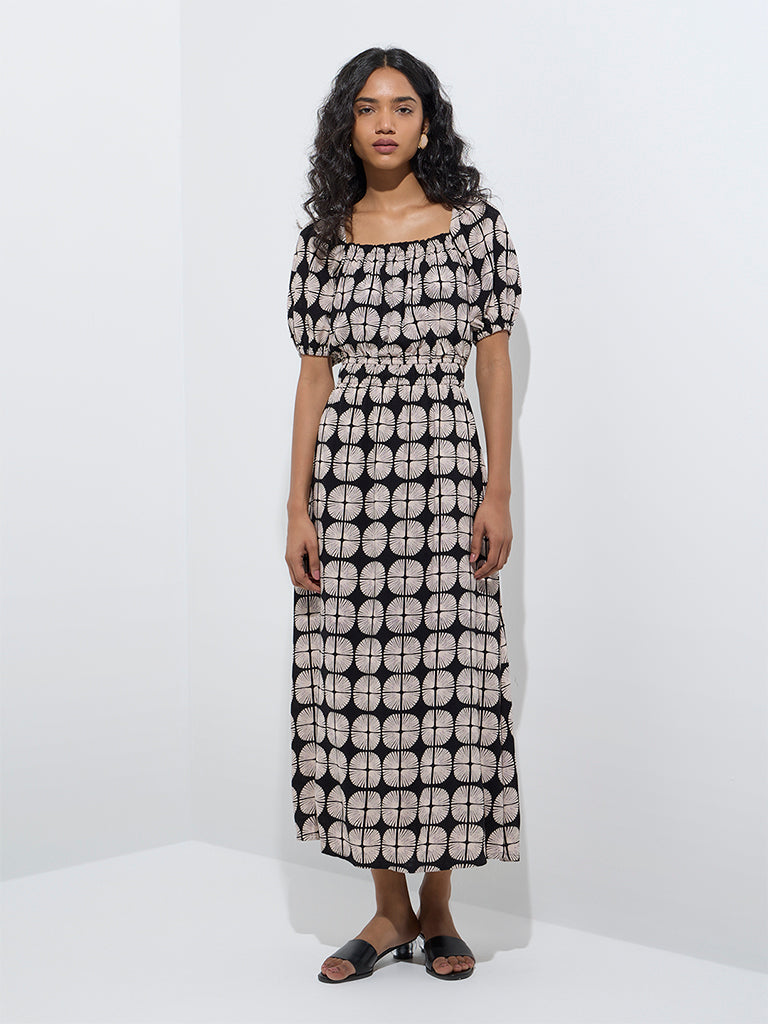 LOV introduces this beige dress enhanced with printed motifs for a graceful touch. Made from quality linen fabric. it features a flattering square neckline. puffed sleeves. and elasticated detailing at the waist for a comfortable fit. perfect for both daytime outings and evening gatherings.