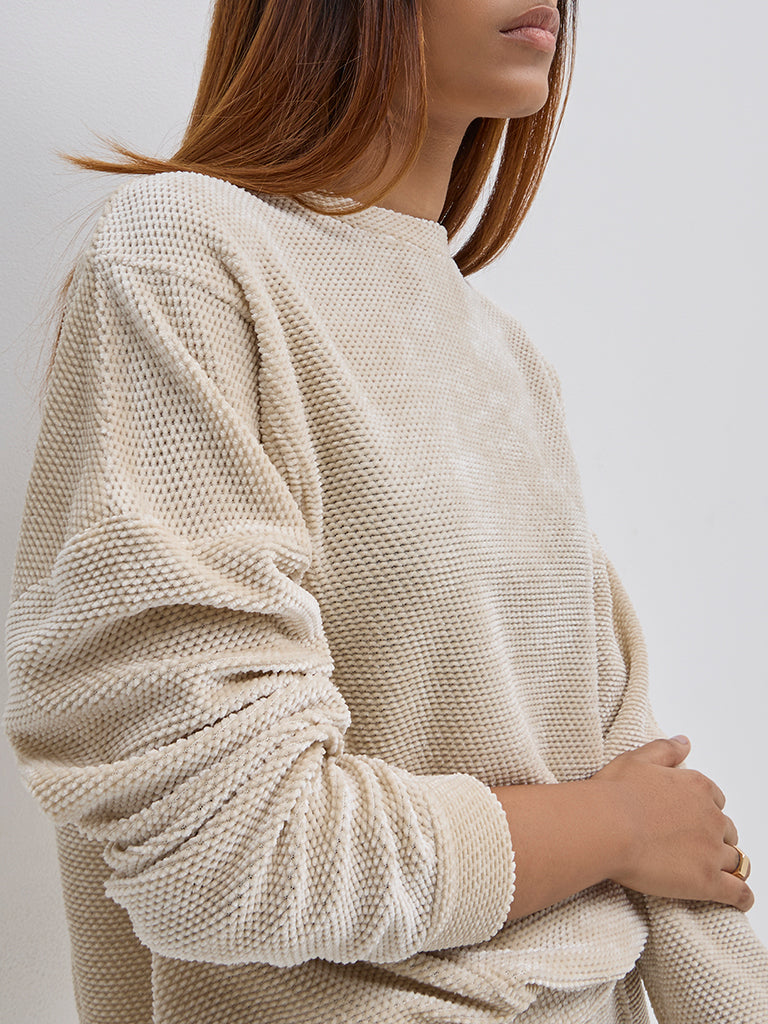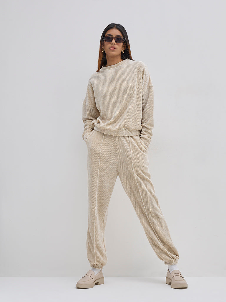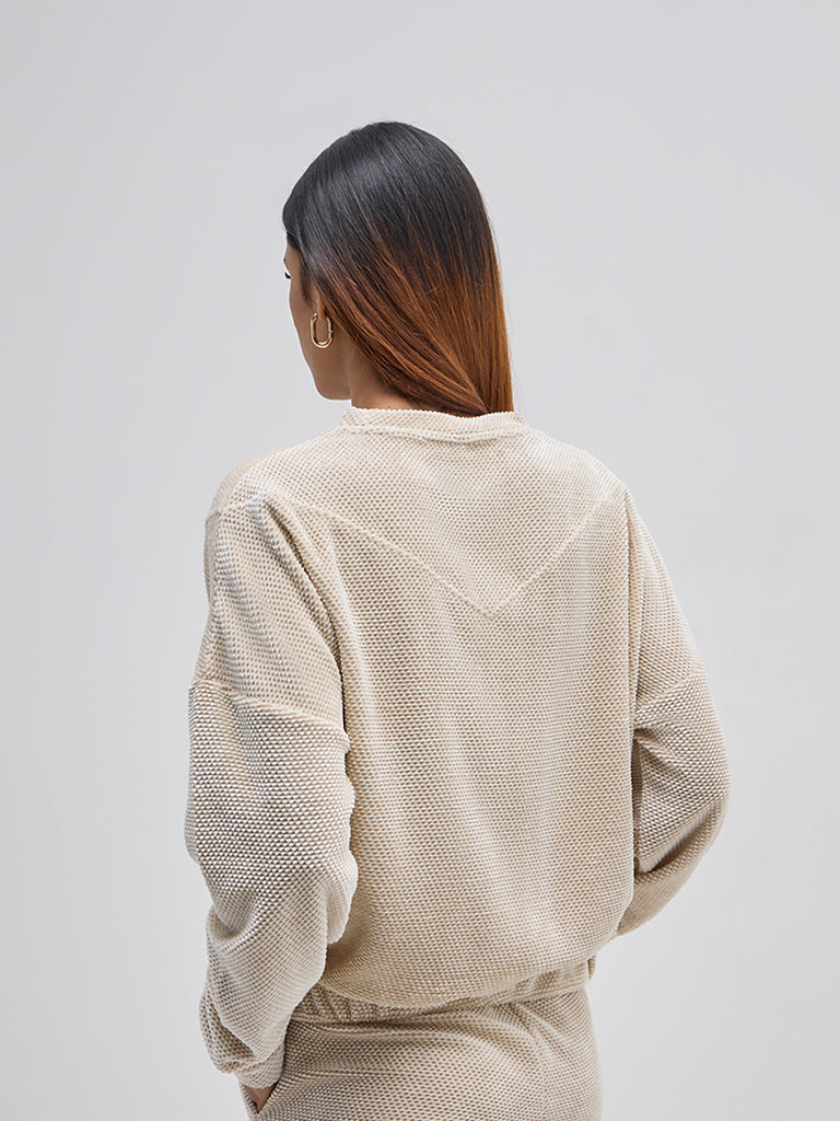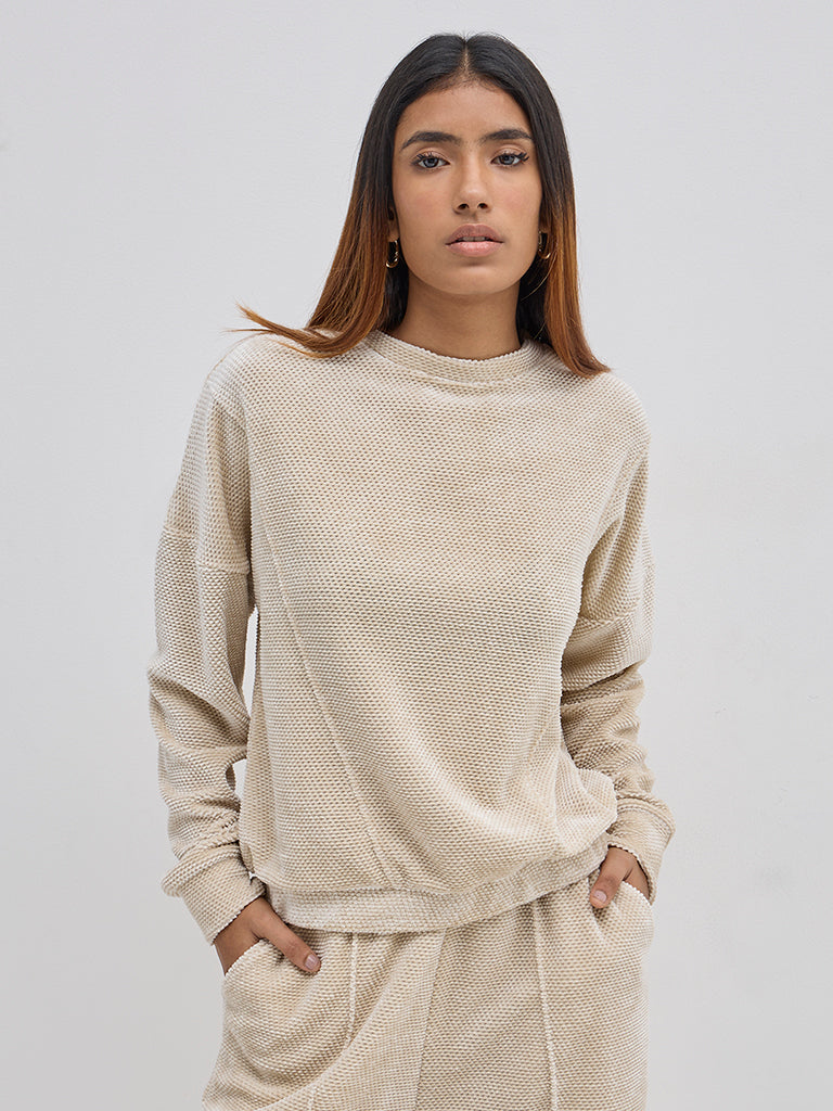 LOV Beige Self Patterned Velveteen Sweatshirt