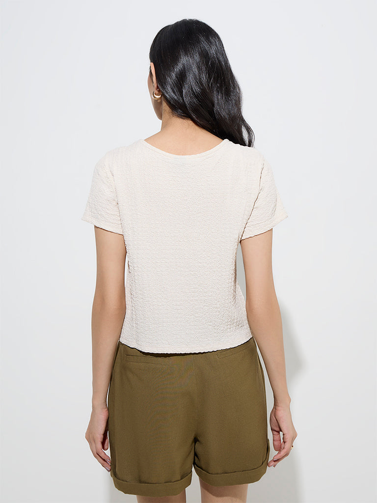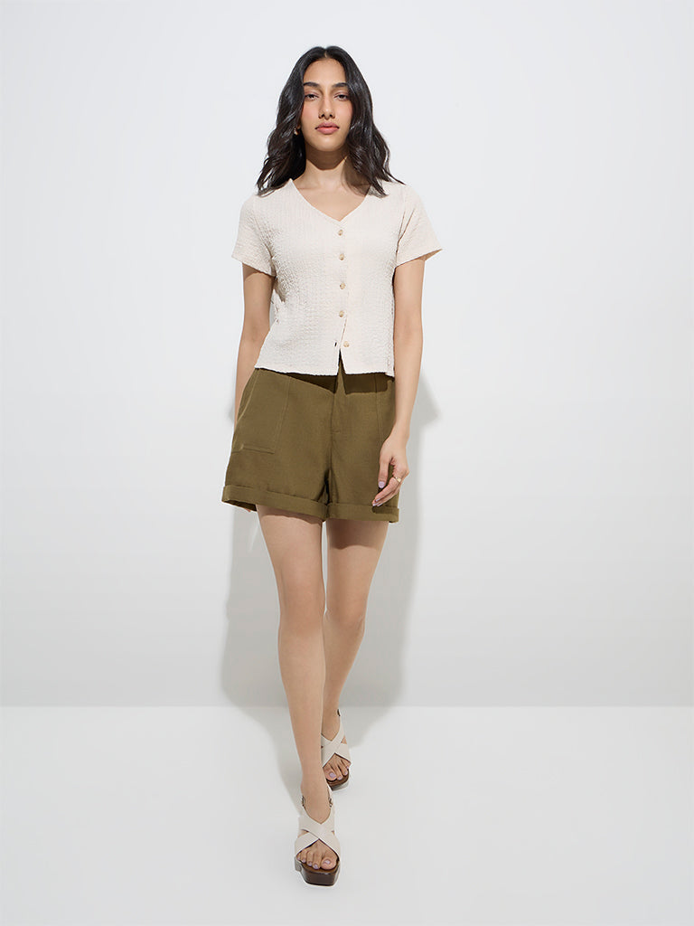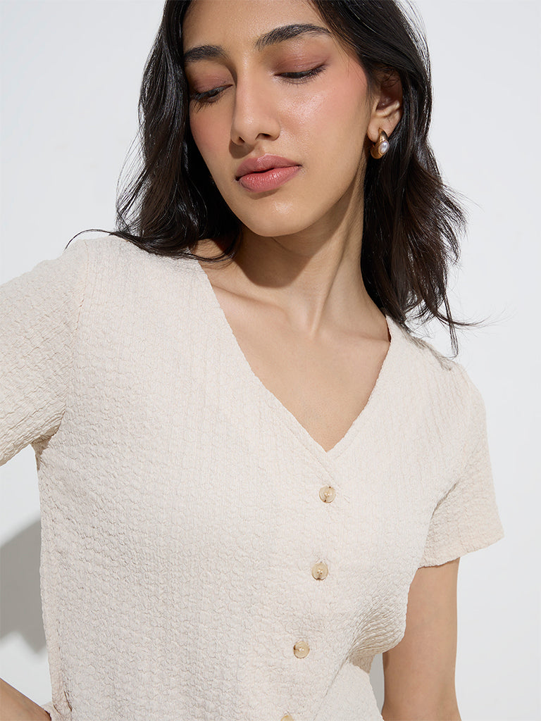 This beige top from LOV is milled from a crepe fabric. It includes a V-neck that extends to a button placket and short sleeves.