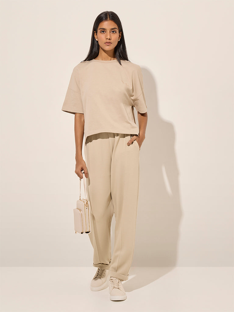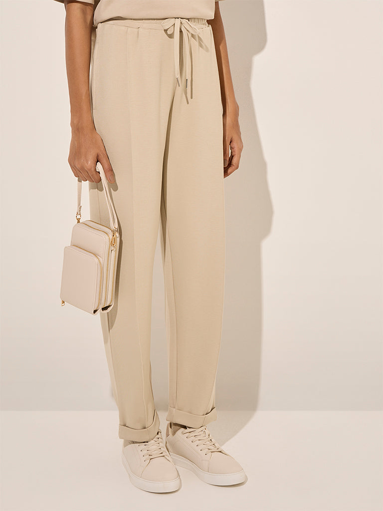 LOV launches these beige track pants with an elasticated waist and attached drawstrings for a personalised fit. Constructed from a blended fabric. it is carved with a mid-rise fit and features pockets on each sides.