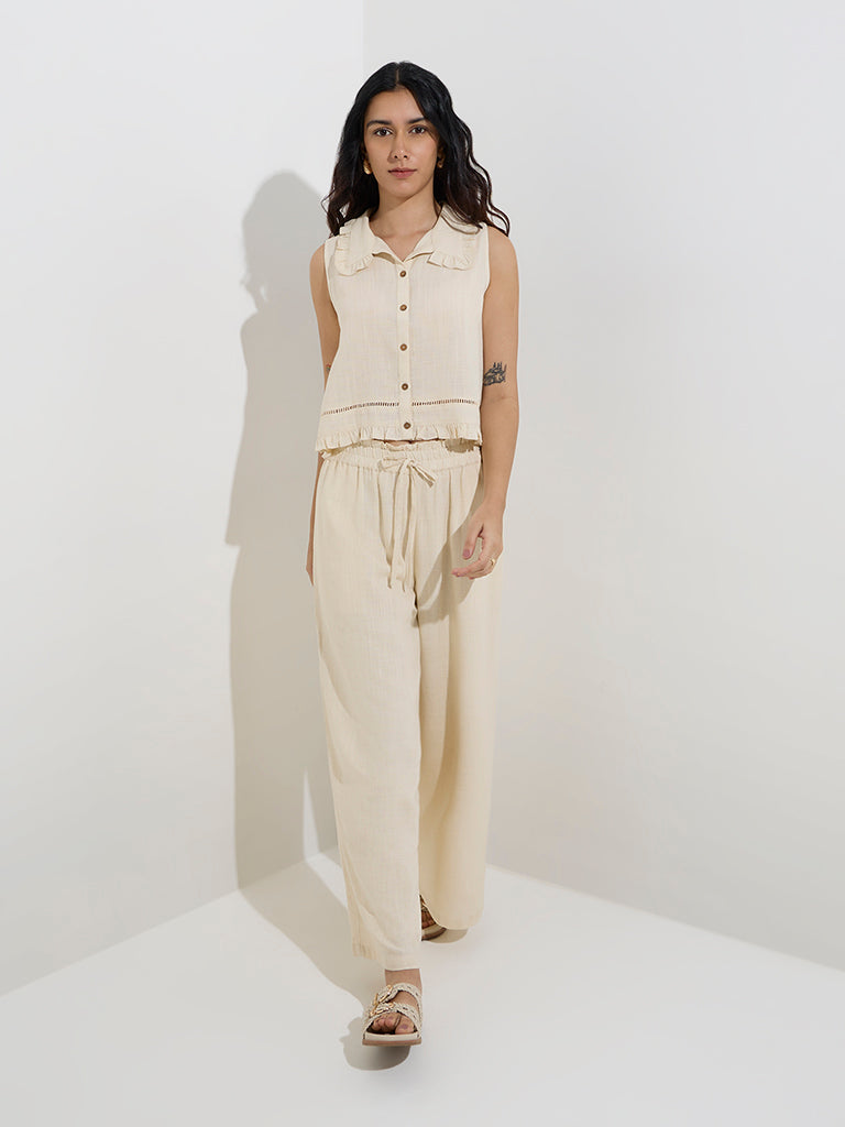 Spun from a luxurious linen-blend fabric. this beige top from LOV exudes effortless elegance. Designed with a delicate ruffled collar that flows into a button placket. it is finished with ruffled detailing along the hem for a charming touch.