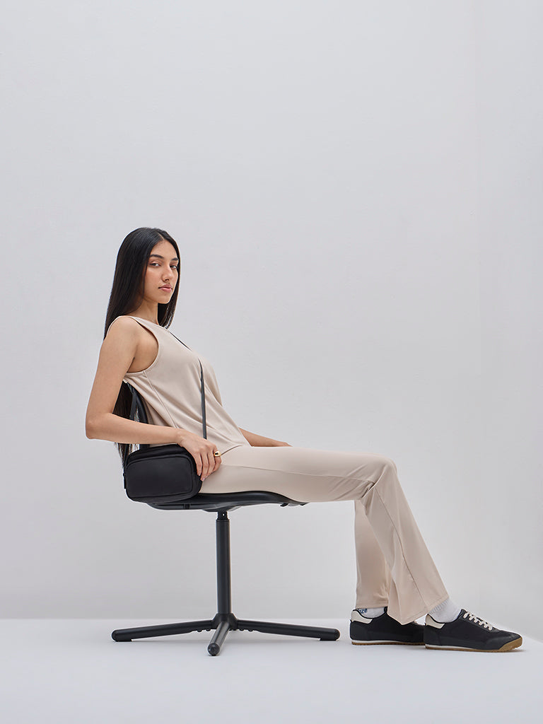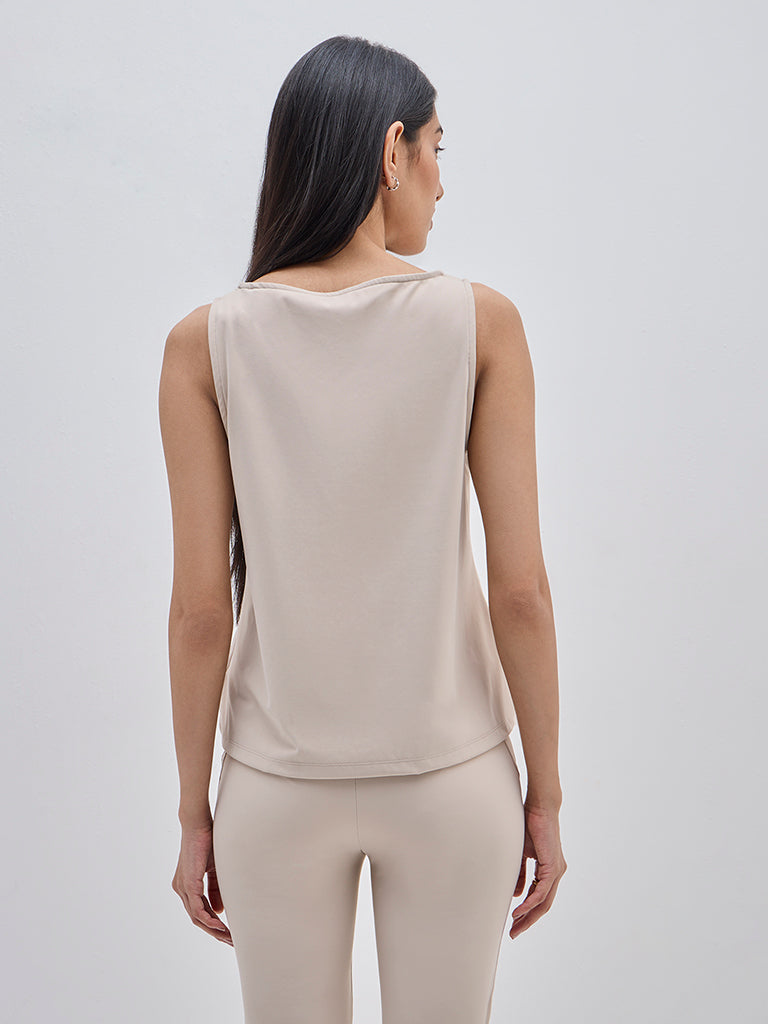 This beige top by LOV is made with soft and stretchable fabric. The activewear features a round neck and sleeveless cut.