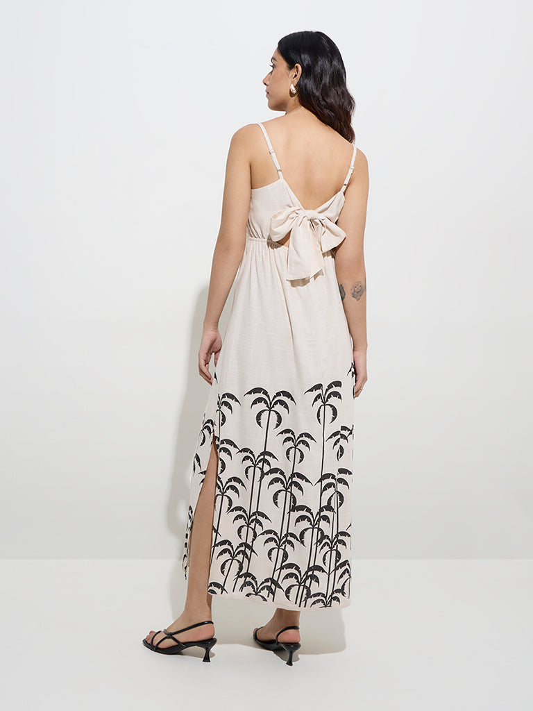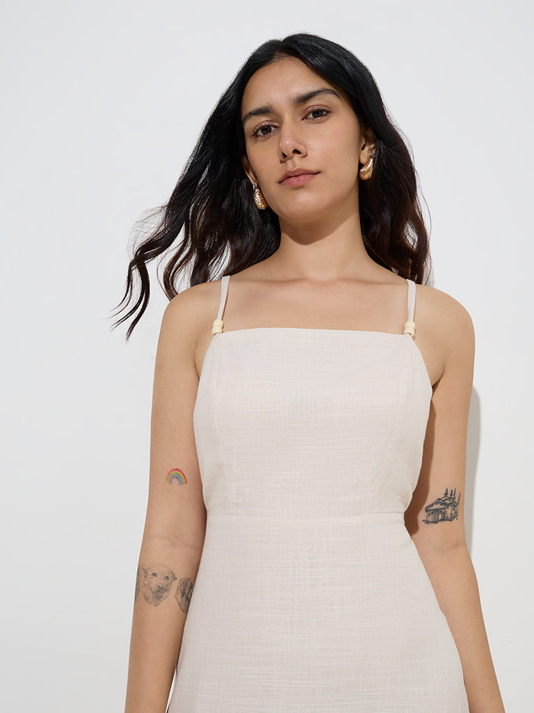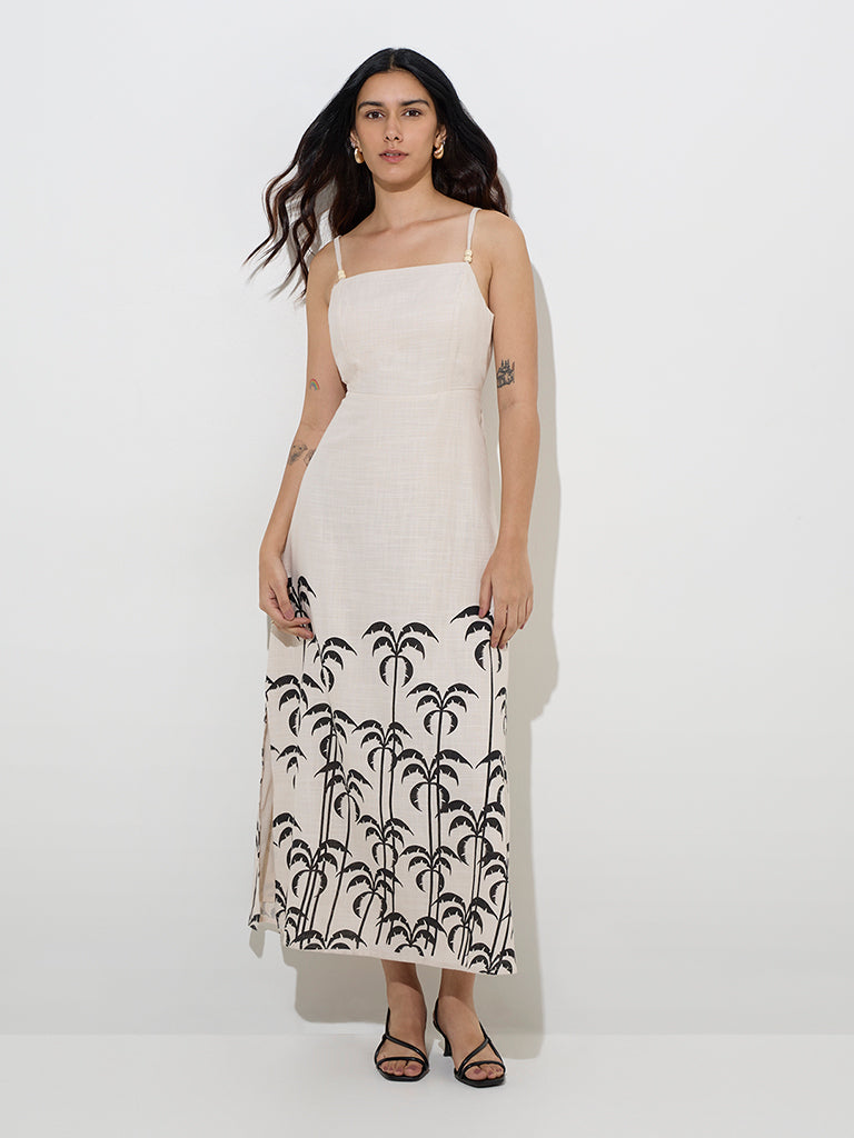 This beige dress from LOV showcases striking tropical prints in a flattering A-line silhouette. Designed with a chic square neckline and adjustable straps. it is finished with a delicate tie-up detail at the back. Crafted from a breezy linen blend. it’s the perfect choice for effortless summer elegance.
