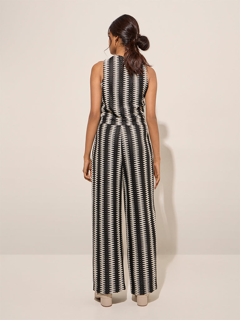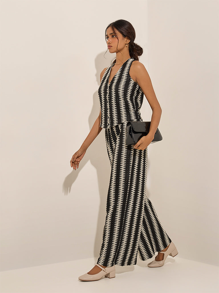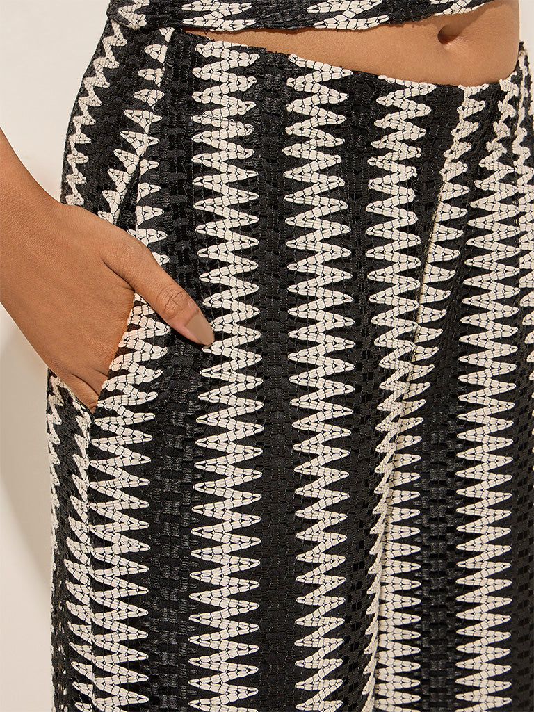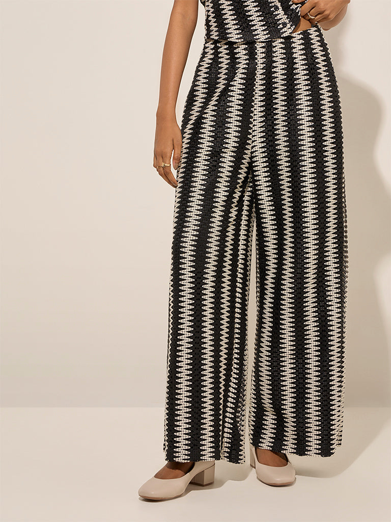 LOV Black Abstract Design Knit-Textured Mid-Rise Trousers