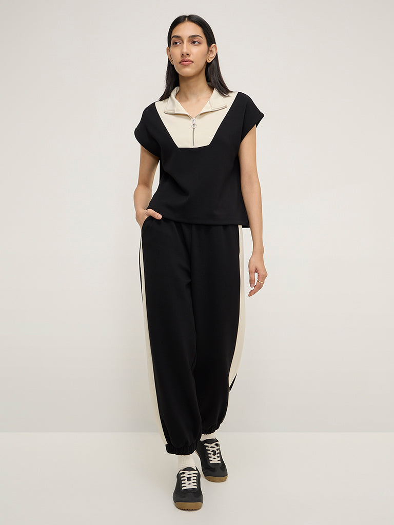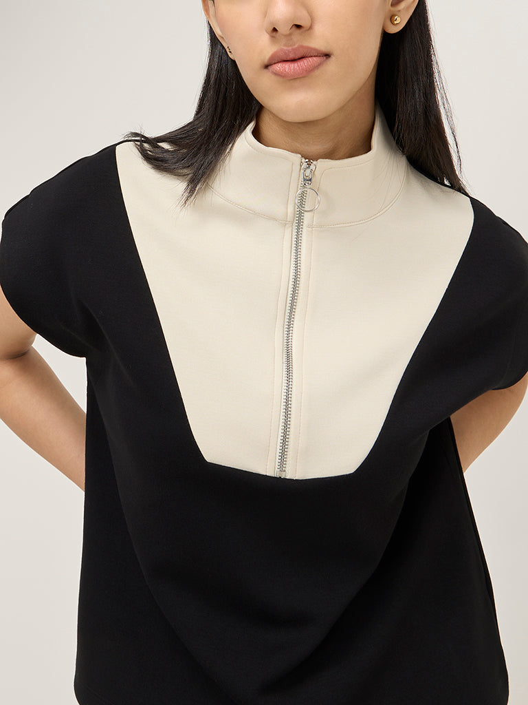 Fashioned in a colour-blocked profile. this black top from LOV is fitted with a high-neck collar that extends to a zipper placket and dolman sleeves.