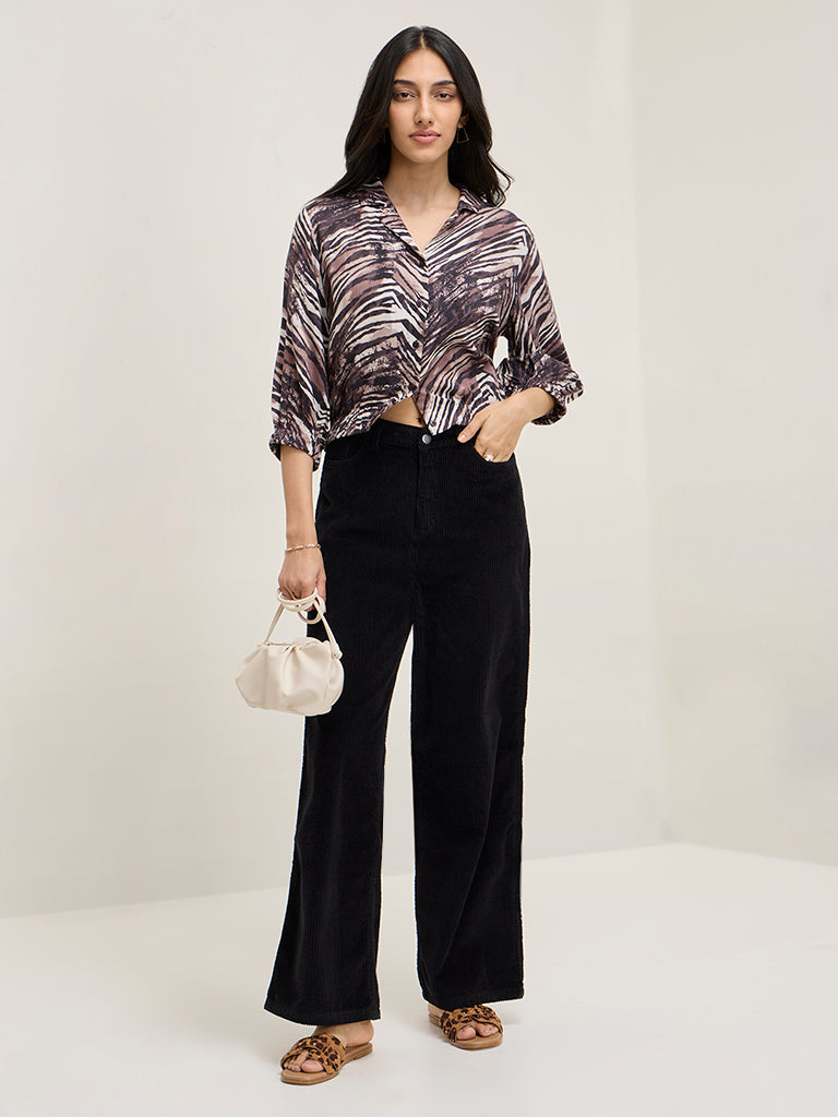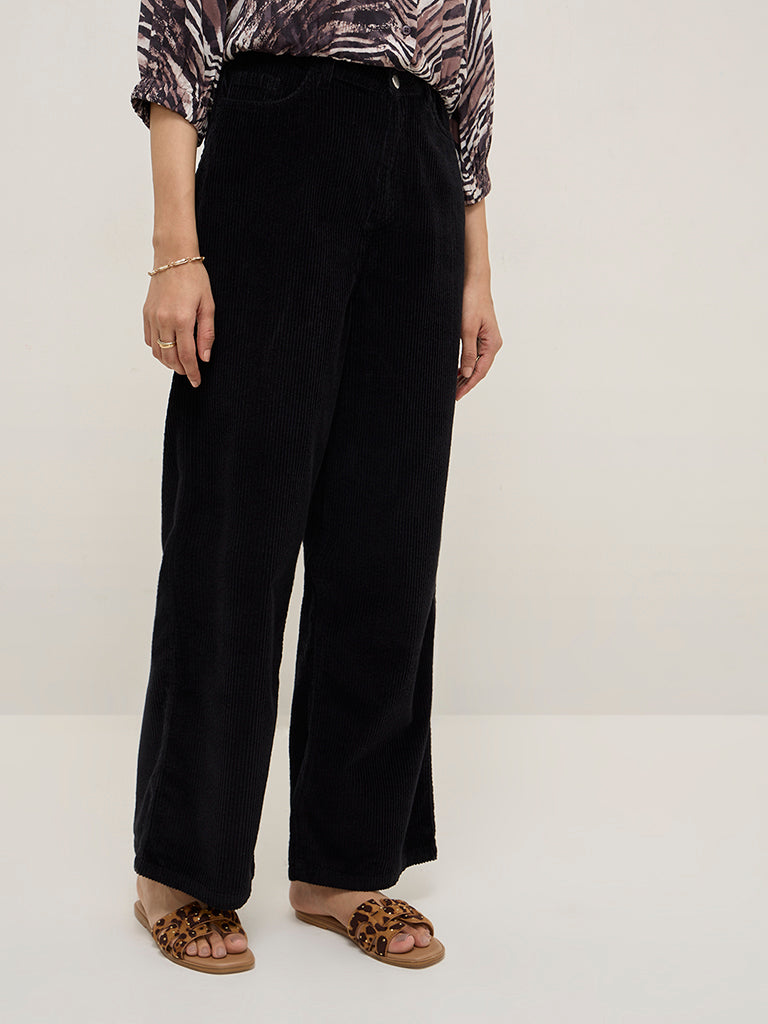 LOV Black Corduroy High-Rise Cotton-Blend Trousers