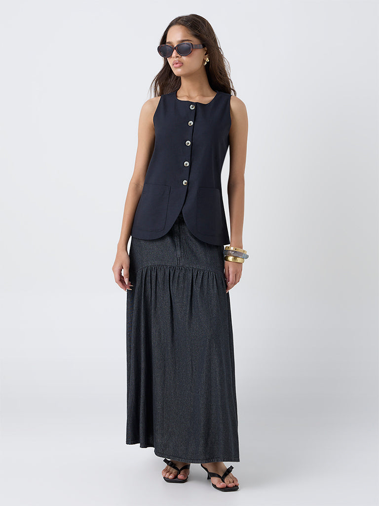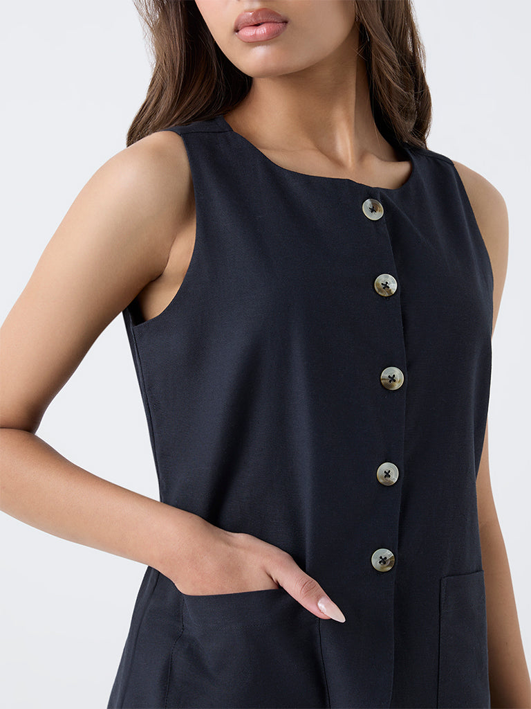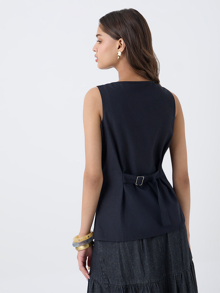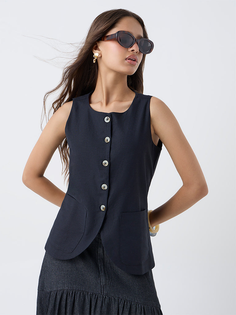 Polished and modern. this black waistcoat top from LOV redefines tailoring with a feminine edge. Crafted from a cotton-blend fabric that offers gentle structure. it features a clean crew neckline. button placket. and sleeveless cut.