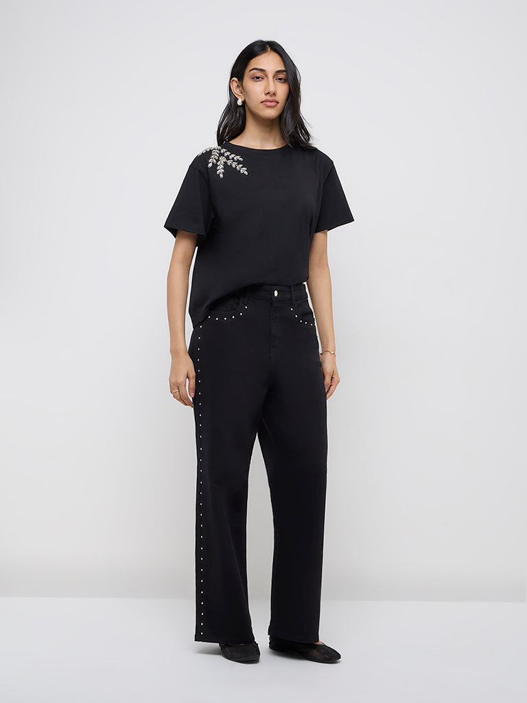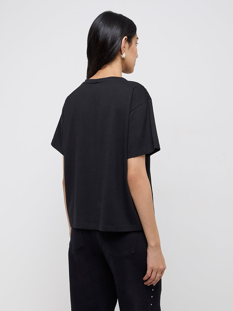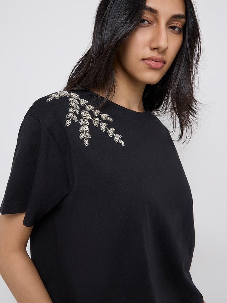 This black t-shirt from LOV is adorned with diamanté embellishments. Made from pure-cotton. it comes fitted with a round neck and half sleeves.