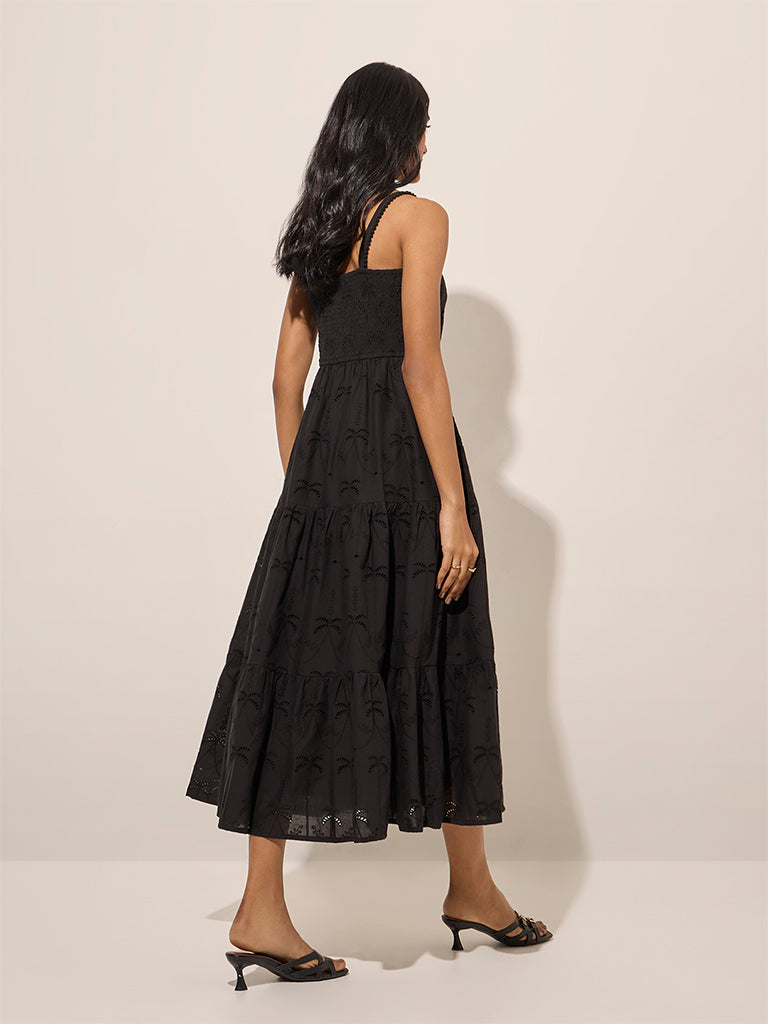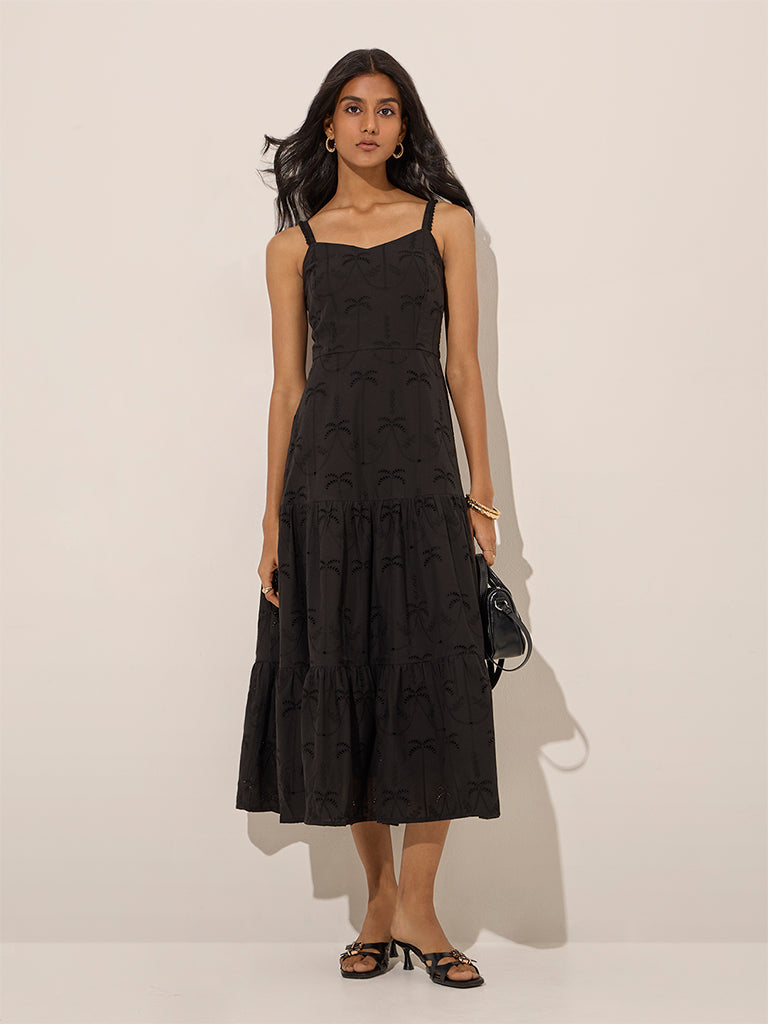 This black dress from LOV flaunts a tiered silhouette with intricate embroidered work. Made from pure-cotton. it includes a V-neck and adjustable straps with a smocked back.