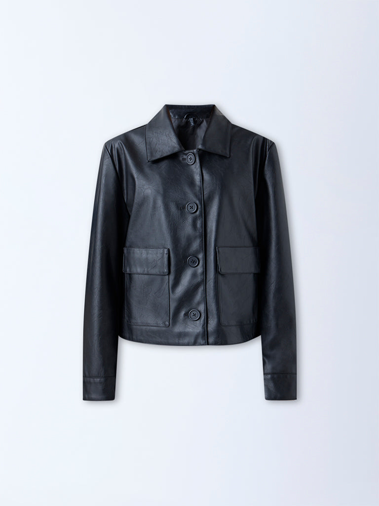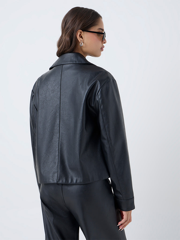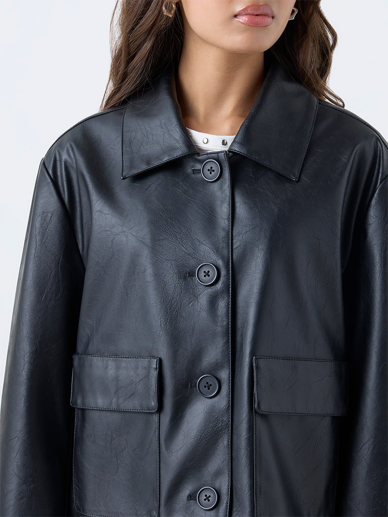 Sleek and striking. this black faux leather jacket from LOV redefines contemporary edge with polished precision. Designed with a classic collar. button placket. and full sleeves. it balances structure with effortless charm.