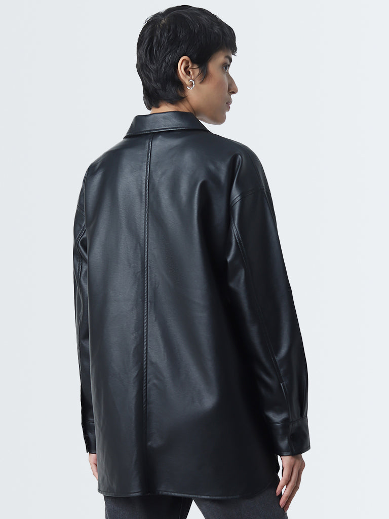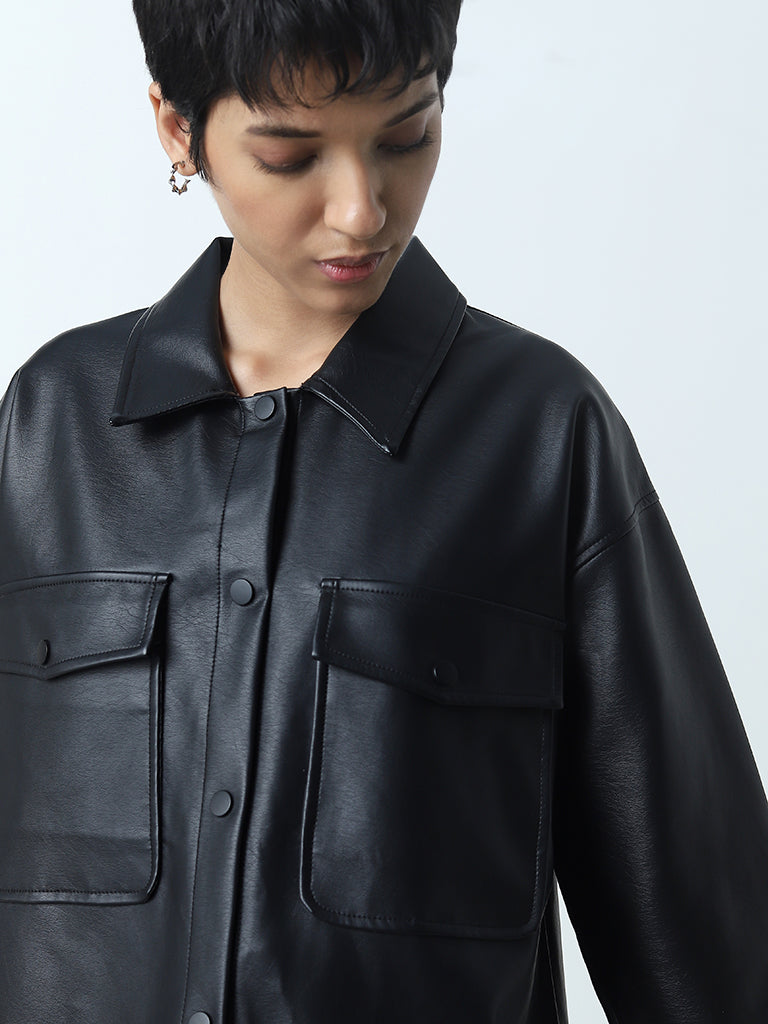This black jacket from LOV is fashioned with a faux-leather finish. Crafted from a breathable fabric. the versatile separate is fitted with a collar that extends to a button placket and full sleeves. The flap pockets lend a functional bonus.