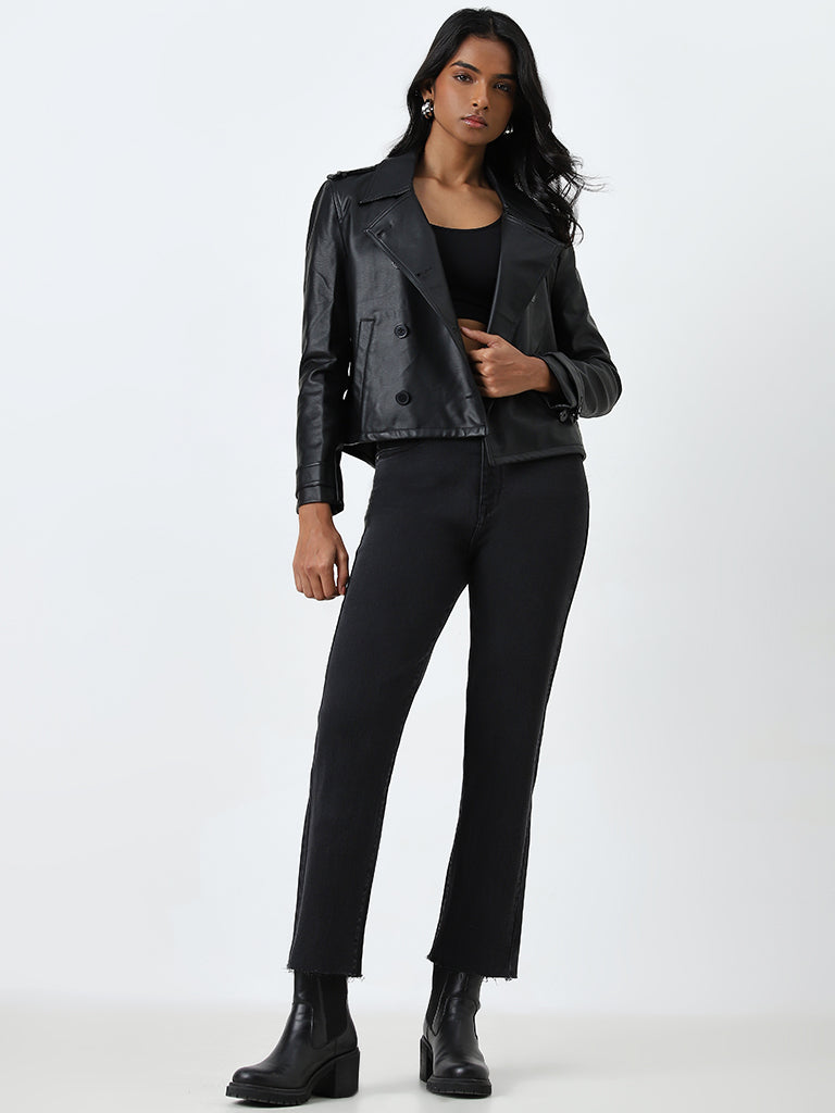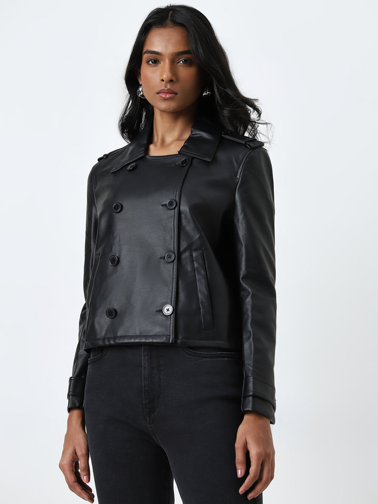 This black jacket from LOV is designed with a faux-leather exterior. Milled from an insulating fabric. it features a collar with a double button placket and full sleeves. The welt pockets add practicality.