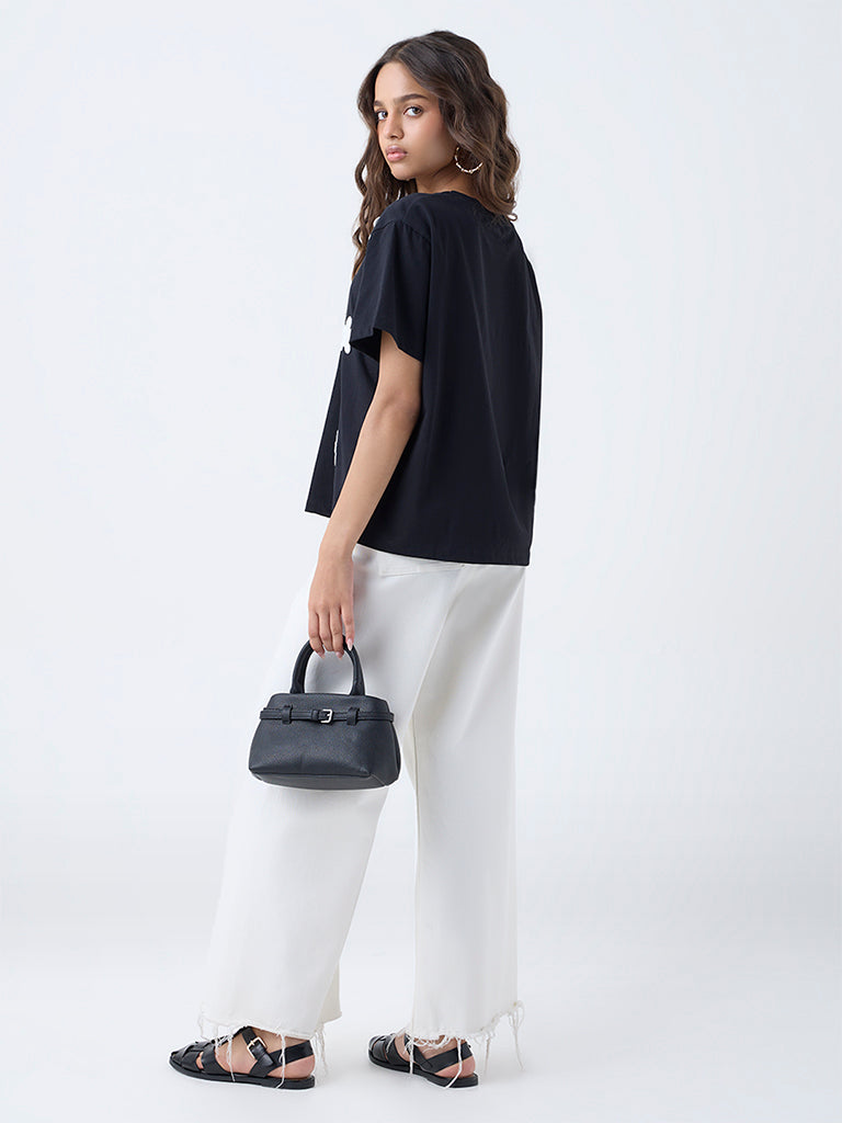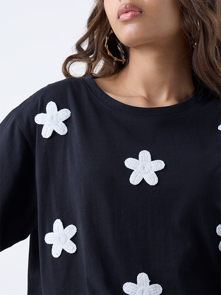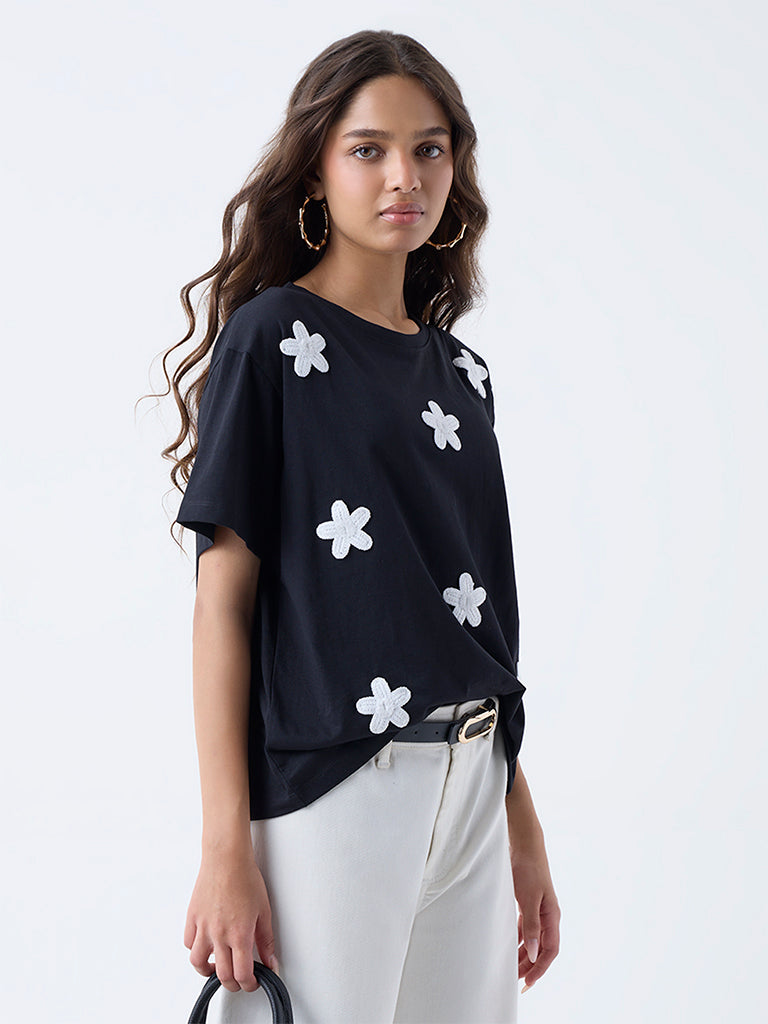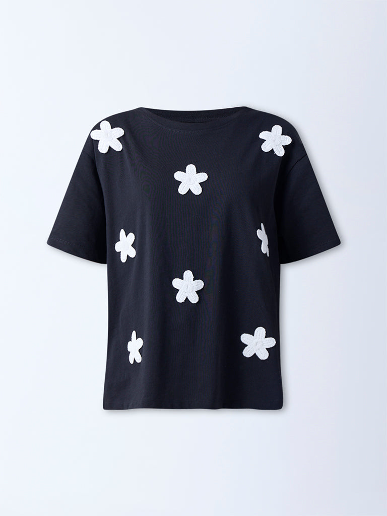 This black cotton T-shirt from LOV features delicate floral embroidery in a contrasting hue. adding a touch of elegance to a casual staple. Designed with a round neck and short sleeves. it offers a relaxed fit. perfect for everyday wear or effortless layering.