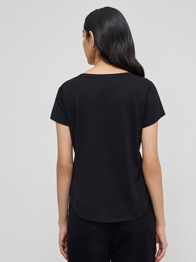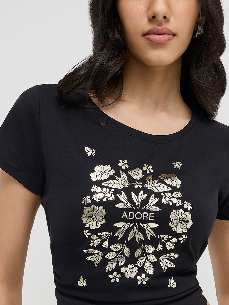 Showcasing floral prints. this black t-shirt from LOV is fitted with a round neck and short sleeves. Its breathable composition ensures all-day comfort.