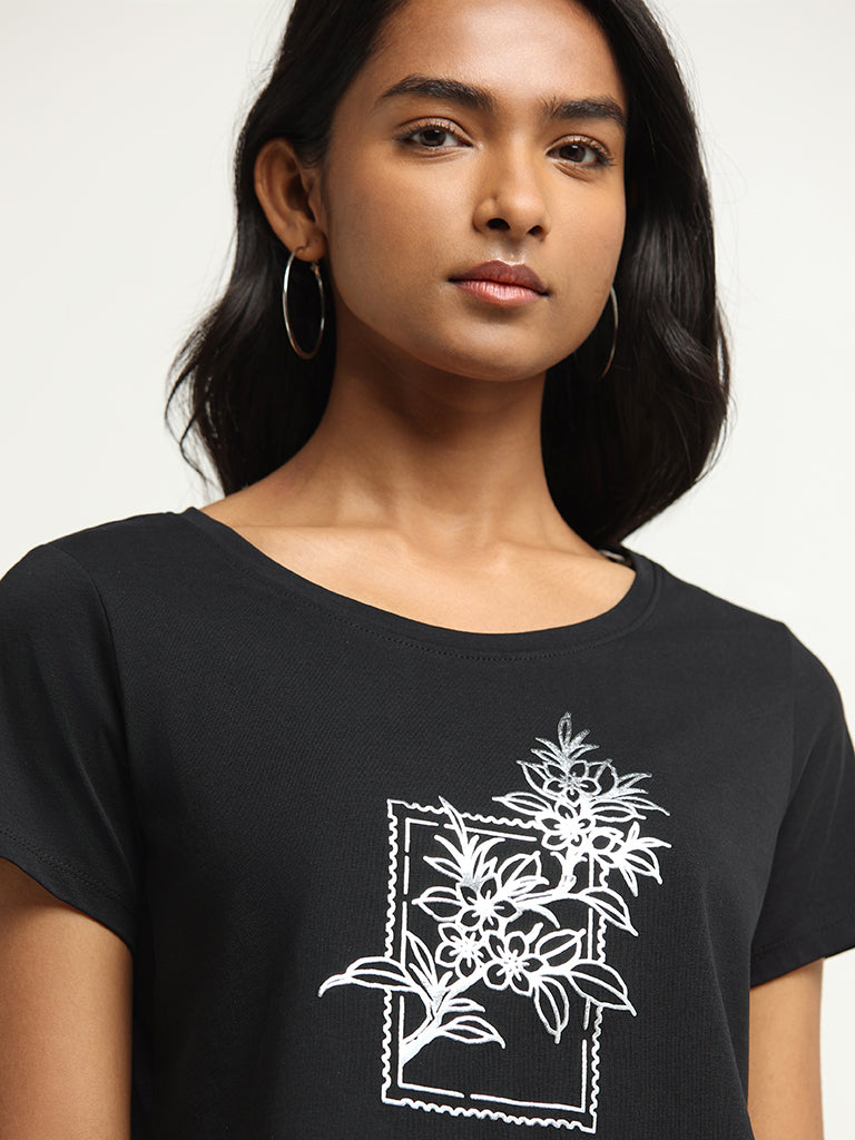 This LOV black t-shirt features a white botanical print within a square frame. round neck and a short sleeve.