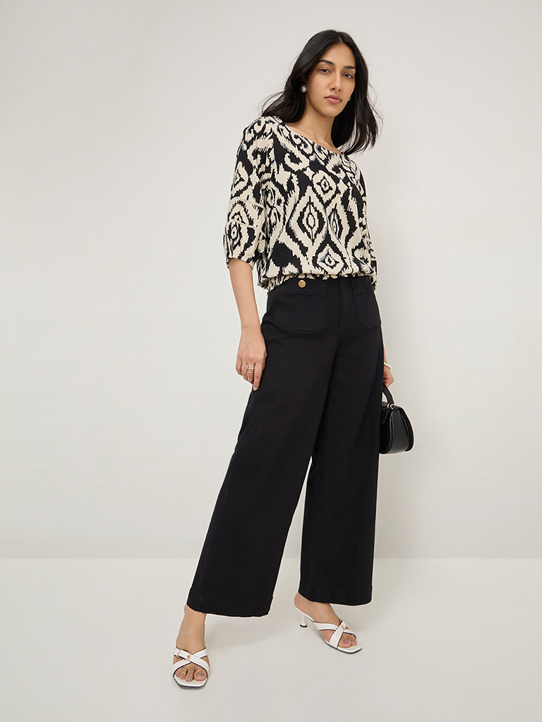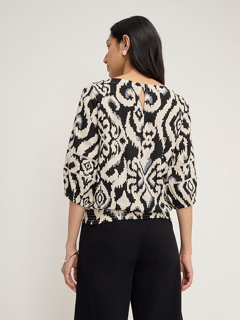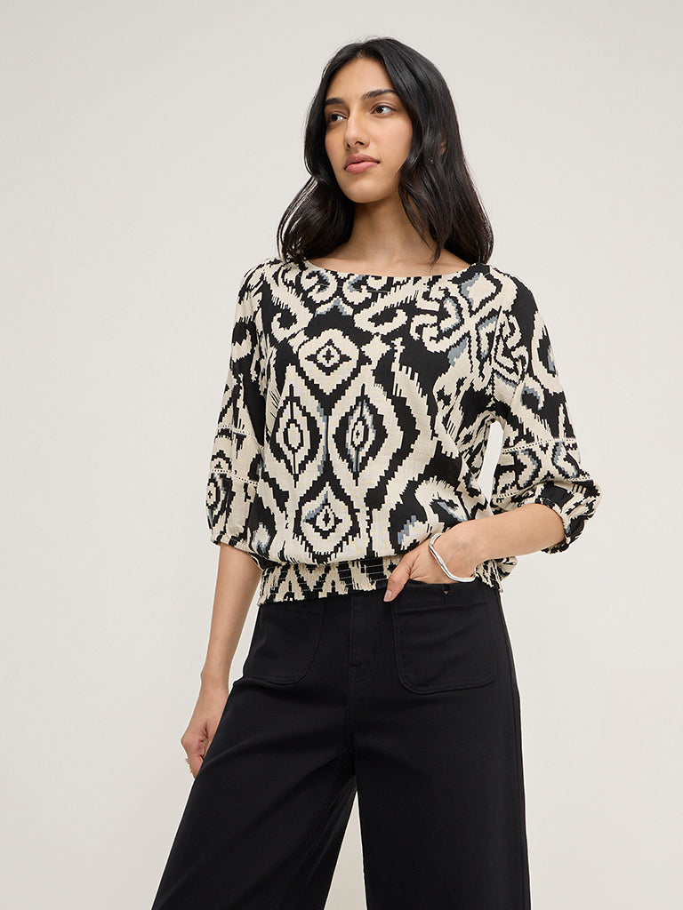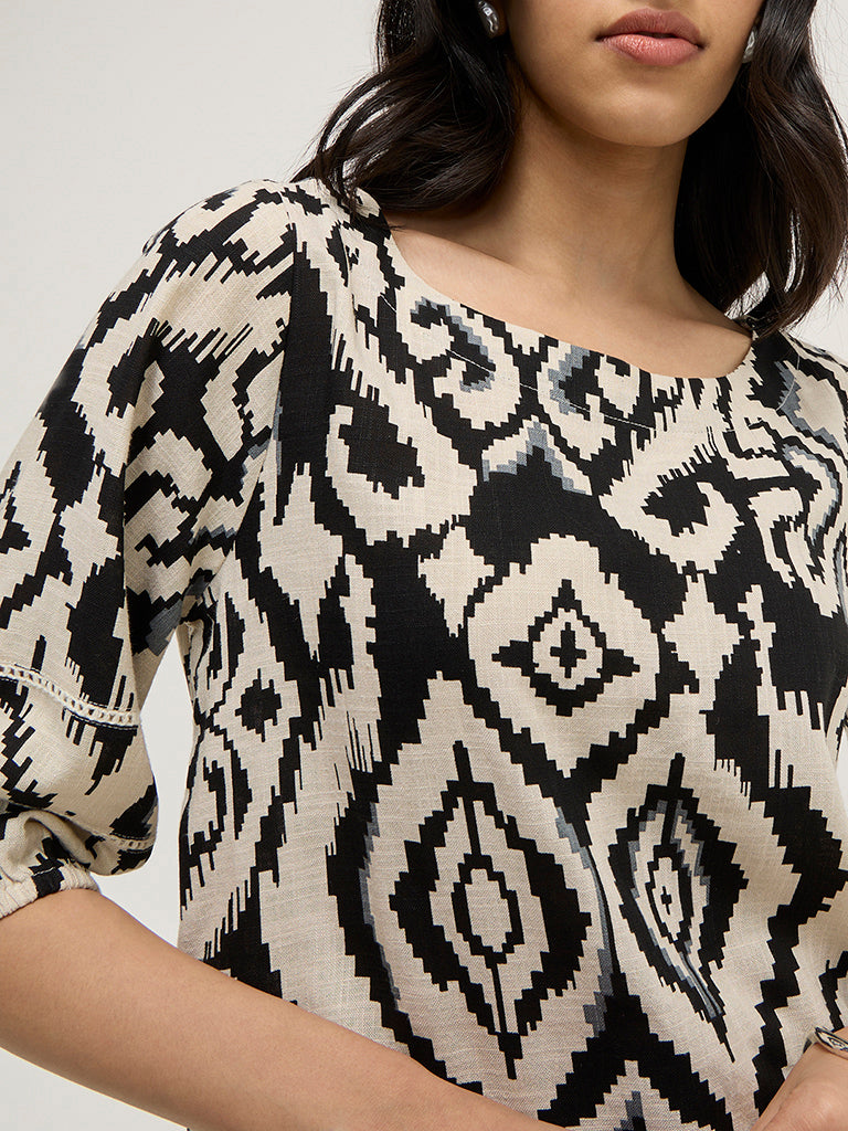 This black top from LOV spotlights ikat designs. Crafted from a blended linen fabric. it includes a boat neck and blouson sleeves.