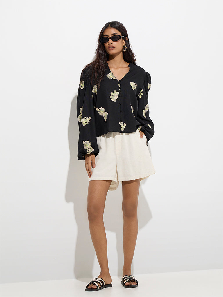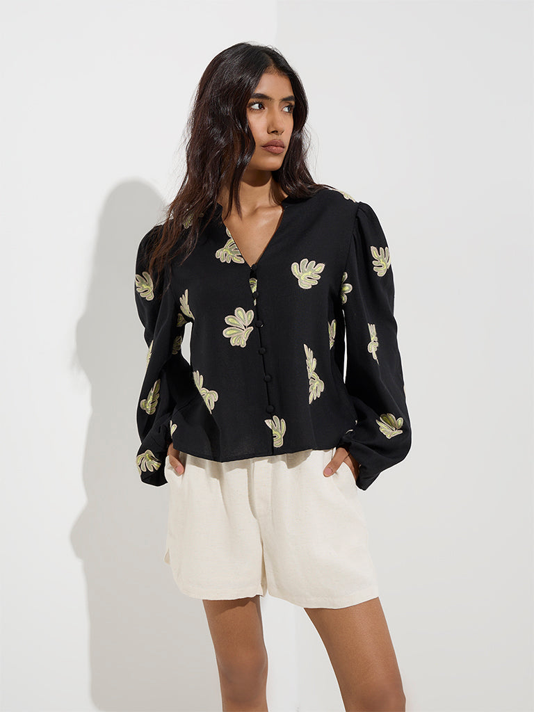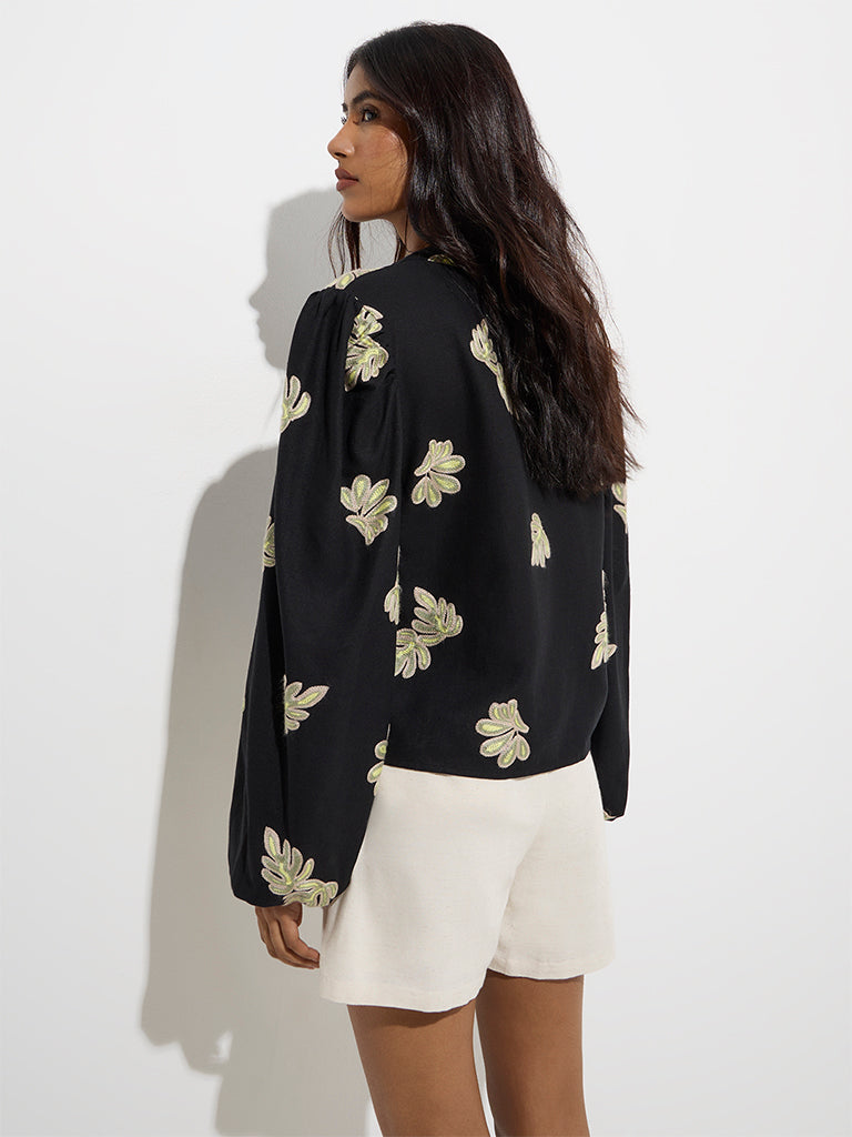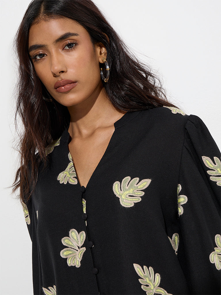 This black top from LOV captures modern femininity with exquisite leaf detailing that brings a nature-inspired touch. Made from quality fabric for all-day comfort. it features a mandarin neck that flows into a button placket. while voluminous balloon sleeves add a contemporary finish.