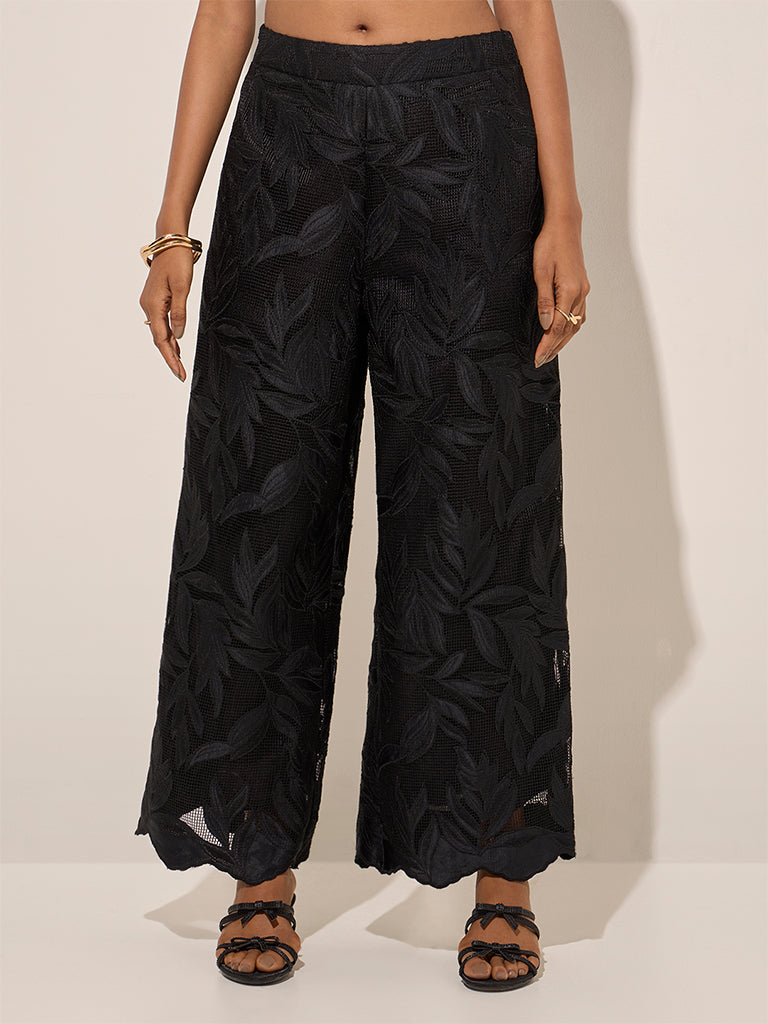 LOV Black Leaf Detailed High-Rise Lace Trousers