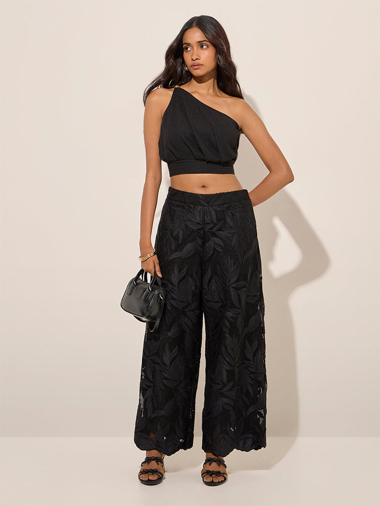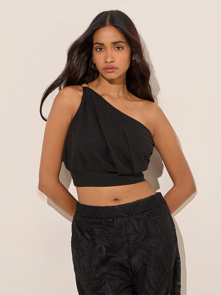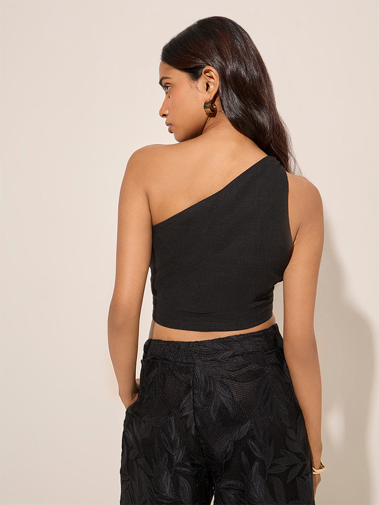 LOV Black One-Shoulder Linen-Blend Crop Top
