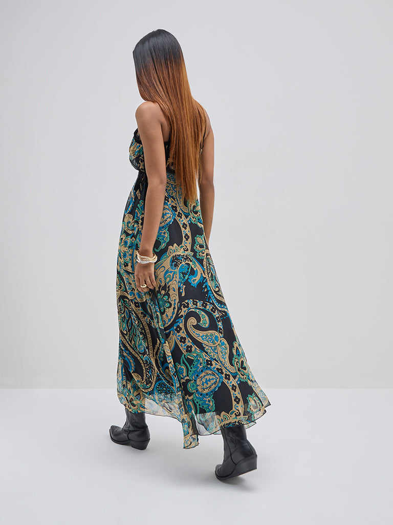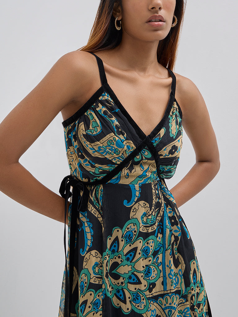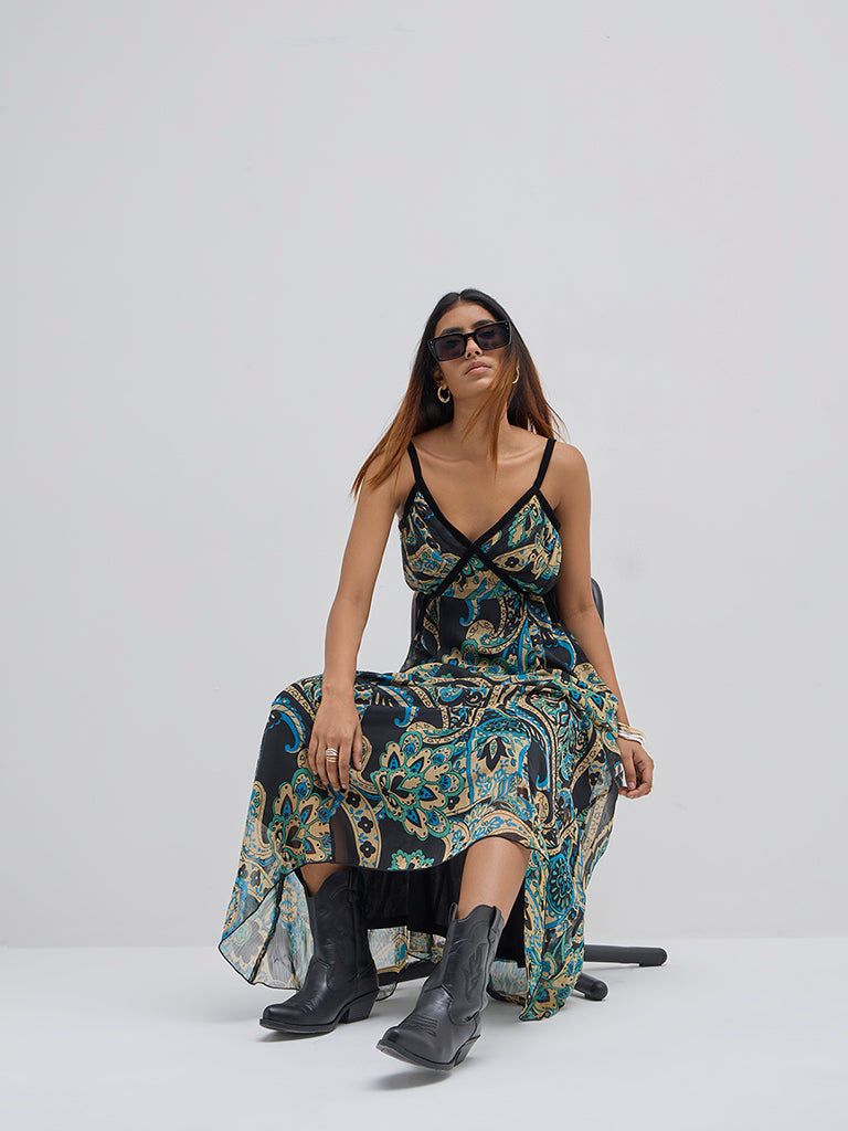 This black dress from LOV spotlights paisley prints. Spun from a lightweight fabric for luxurious comfort. it features a plunge neckline and adjustable straps.