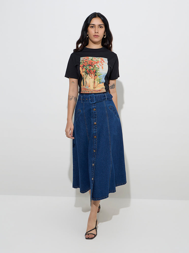 This black t-shirt by LOV is crafted from a cotton-rich fabric for lasting comfort. Displaying a vibrant scenic print. it is fitted with a crew neckline and half sleeves.