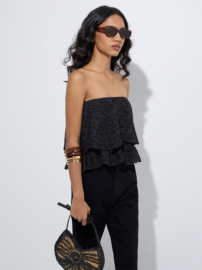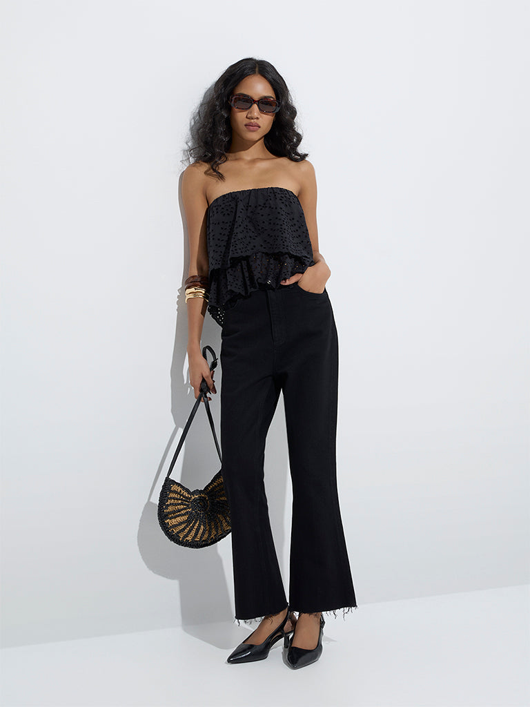 This black top from LOV highlights intricate schiffli designs. bringing delicate charm to your wardrobe. Created from pure cotton. it features ruffle detailing that add movement and femininity.