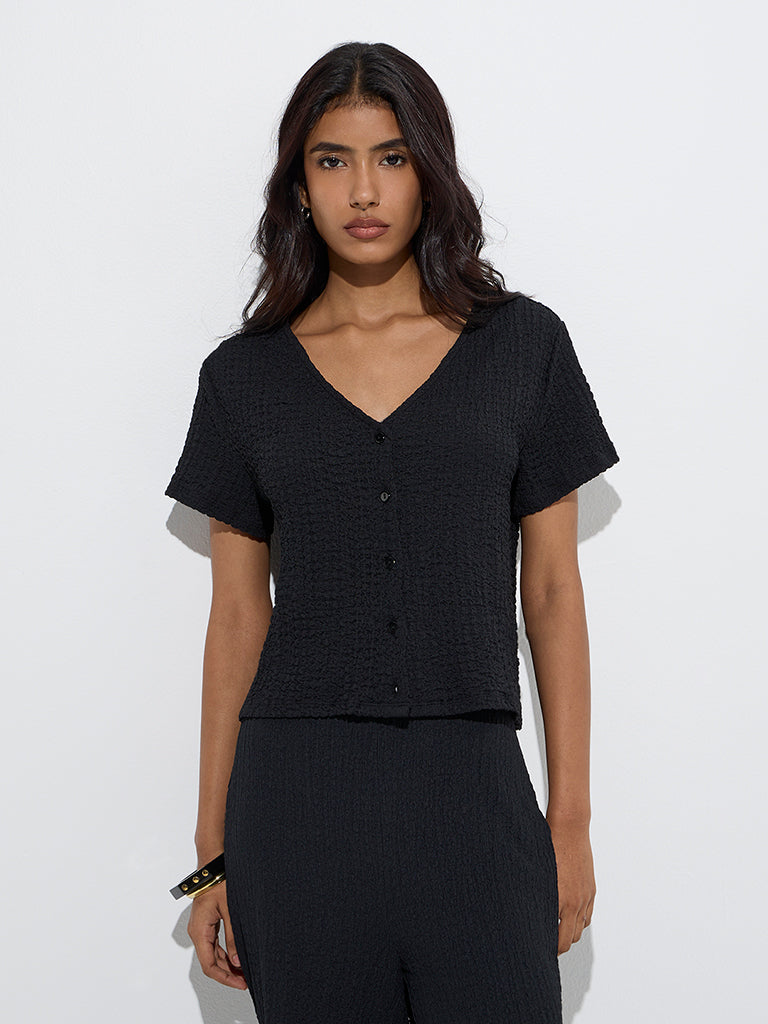 This black top from LOV is created from a self-textured fabric that feels soft and breathable against the skin. Fashioned with a V-neck and short sleeves for a relaxed appeal. it features a button placket for easy wearability.