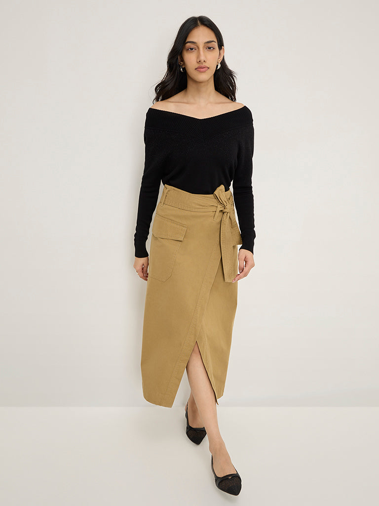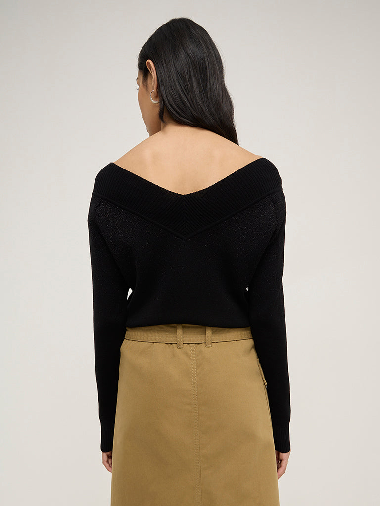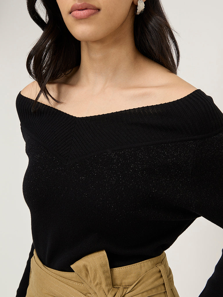This black sweater from LOV is fashioned with shimmer detailing throughout. Its knitted fabric ensures maximum comfort. while the off-shoulder design and full sleeves complete it.