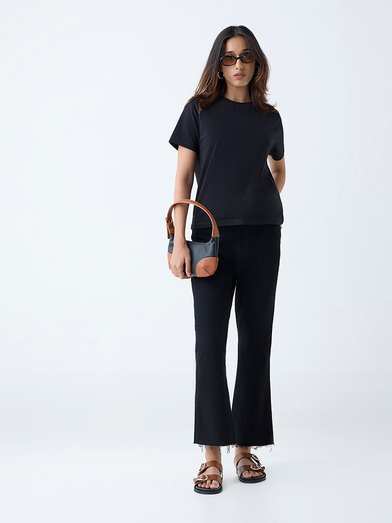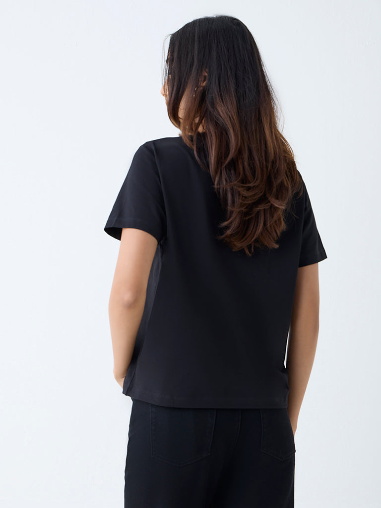 This black tee from LOV is spun from pure cotton for all-day wear. The minimal profile is styled with a ribbed round neck and half sleeves. offering a timeless silhouette that pairs effortlessly with tailored separates or off-duty denim.