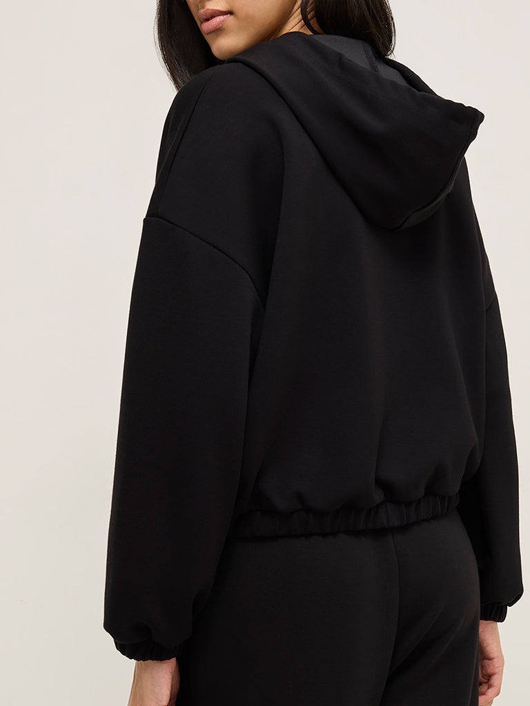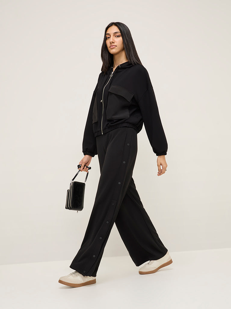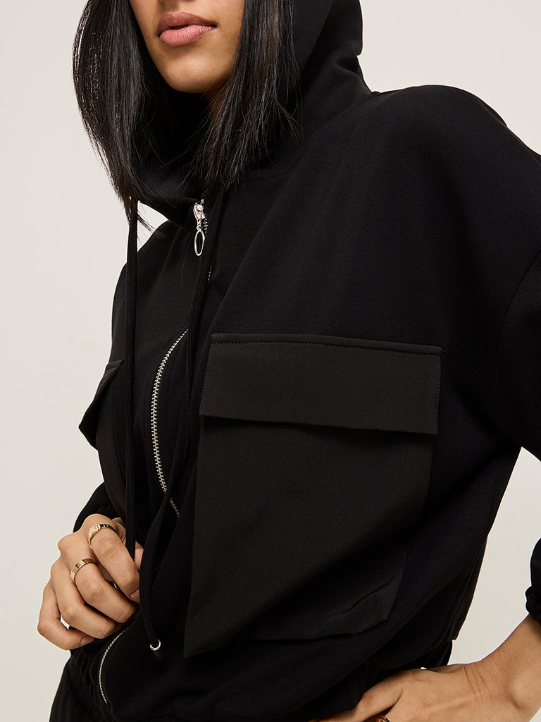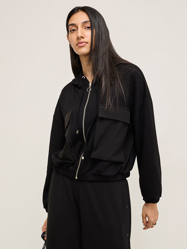 This black jacket from LOV features a solid design. Spun from a breathable fabric. it includes a hood that extends to a zipper placket and dropped sleeves. The flap pockets at the front lend a practical finish.