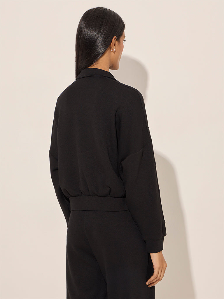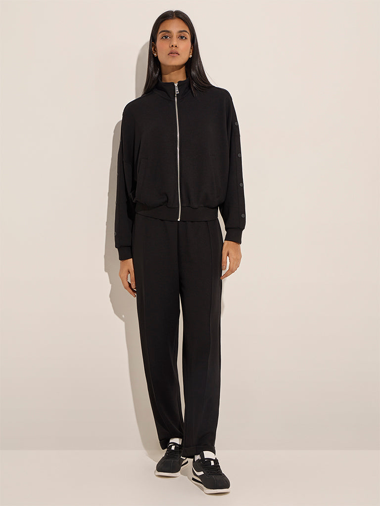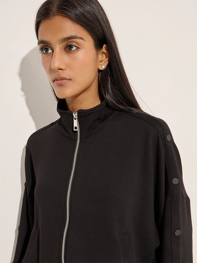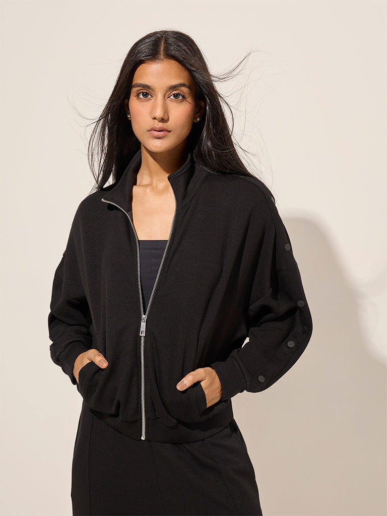 LOV launches this black solid jacket from a breathable fabric. It is designed with a high-neck collar that extends to a zipper placket and full sleeves with buttoned detailing.