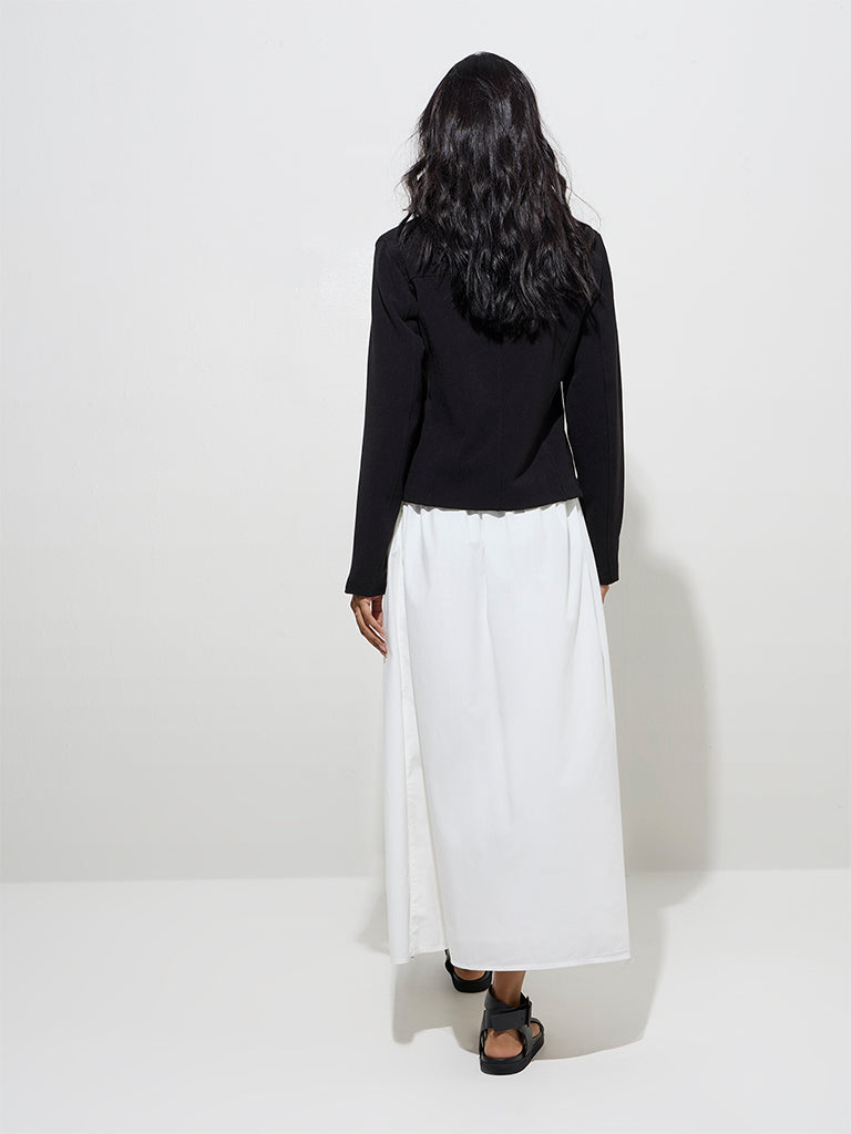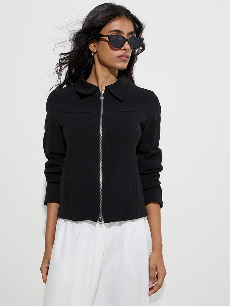 This black jacket from LOV embraces a minimalistic profile with refined detailing. Woven from high-quality fabric. it features a spread collar that extends to a zipper front. and full sleeves—making it a chic and practical choice.