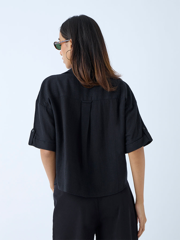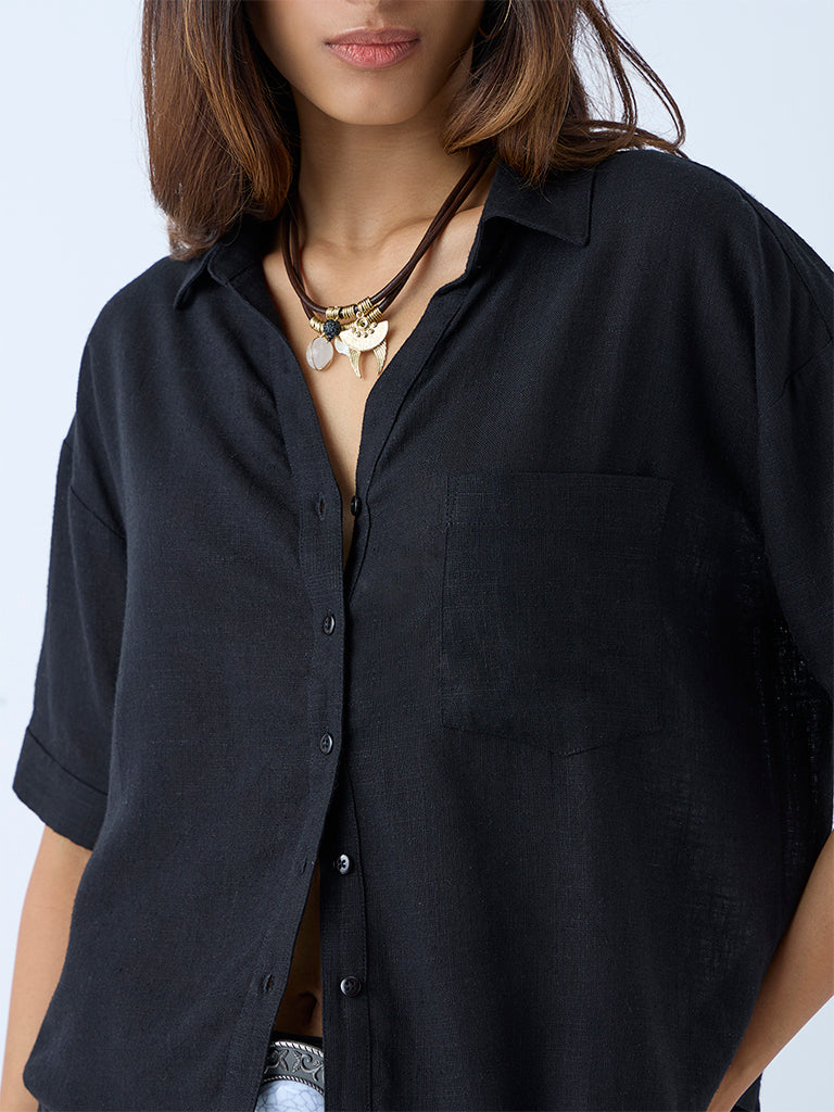 Revamp your everyday basics with this black shirt from LOV. designed in a minimalist profile. Milled from a breathable fabric. it features a sharp collar. button-up front. and half sleeves. while a chest pocket adds a touch of utility.