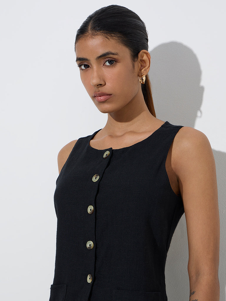 This black waistcoat-style top from LOV is milled from a luxurious linen-blend fabric for sumptuous comfort. It offers a round neck that extends to a button placket and two welt pockets at the front. The buckle detailing at the back ensures a cinched waist.